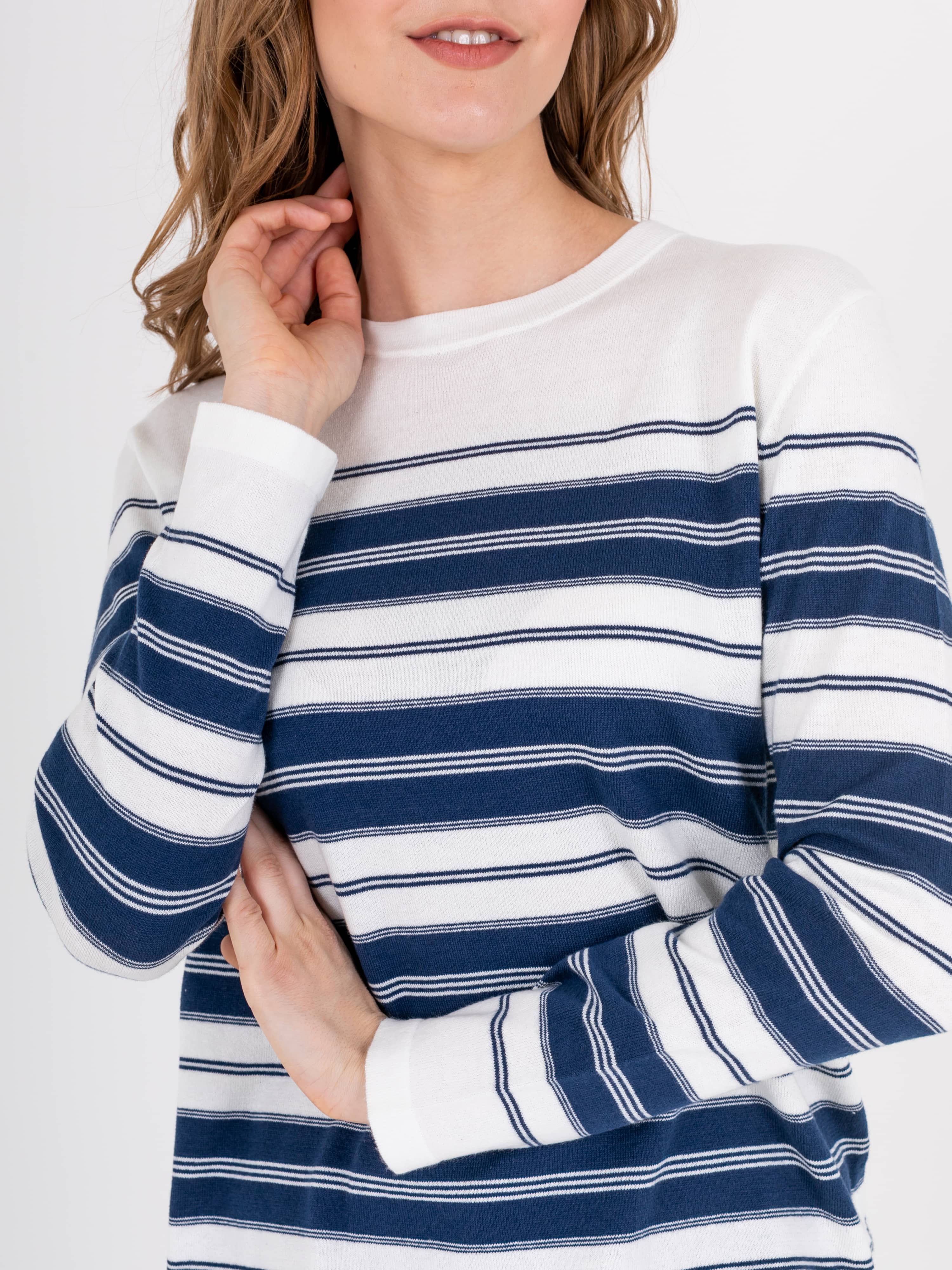 Джемпер средней длины прямого силуэта из легкого хлопка с добавлением акрила, дизайнерская особенность модели – рисунок в полоску. Длинные втачные рукава. Круглый вырез горловины.