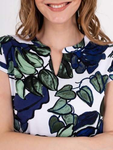Футболка средней длины прямого силуэта из легкой, мягкой вискозы с добавлением эластана, дизайнерская особенность модели – эффектный растительный принт. Короткие цельнокроеные рукава с манжетами. Круглый вырез горловины с разрезом, обработан косой бейкой.