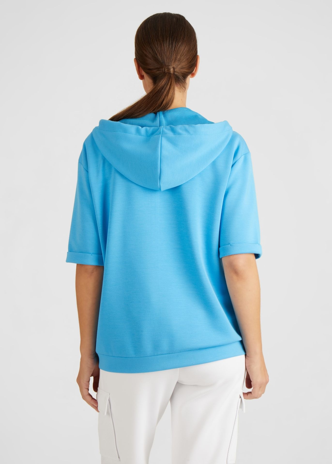 Эта модная толстовка с короткими рукавами, капюшоном и завязками подойдет для любого случая. Однотонная куртка имеет молнию. Особого упоминания заслуживают элегантные детали: вышитая надпись и стразы украшают переднюю часть куртки. Практичный накладной карман завершает дизайн. Толстовка – настоящий маст-хэв для женщин, следящих за модой. Длина по спинке от плеча для размера 46: 62 см.