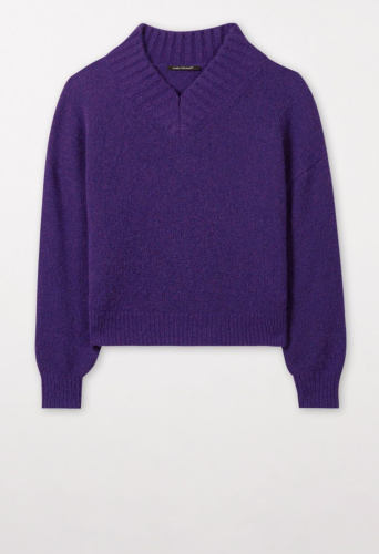 Легкий пуловер с V-образным вырезом из высококачественной итальянской полушерстяной ткани. Заниженные плечи помогают создать повседневный образ.