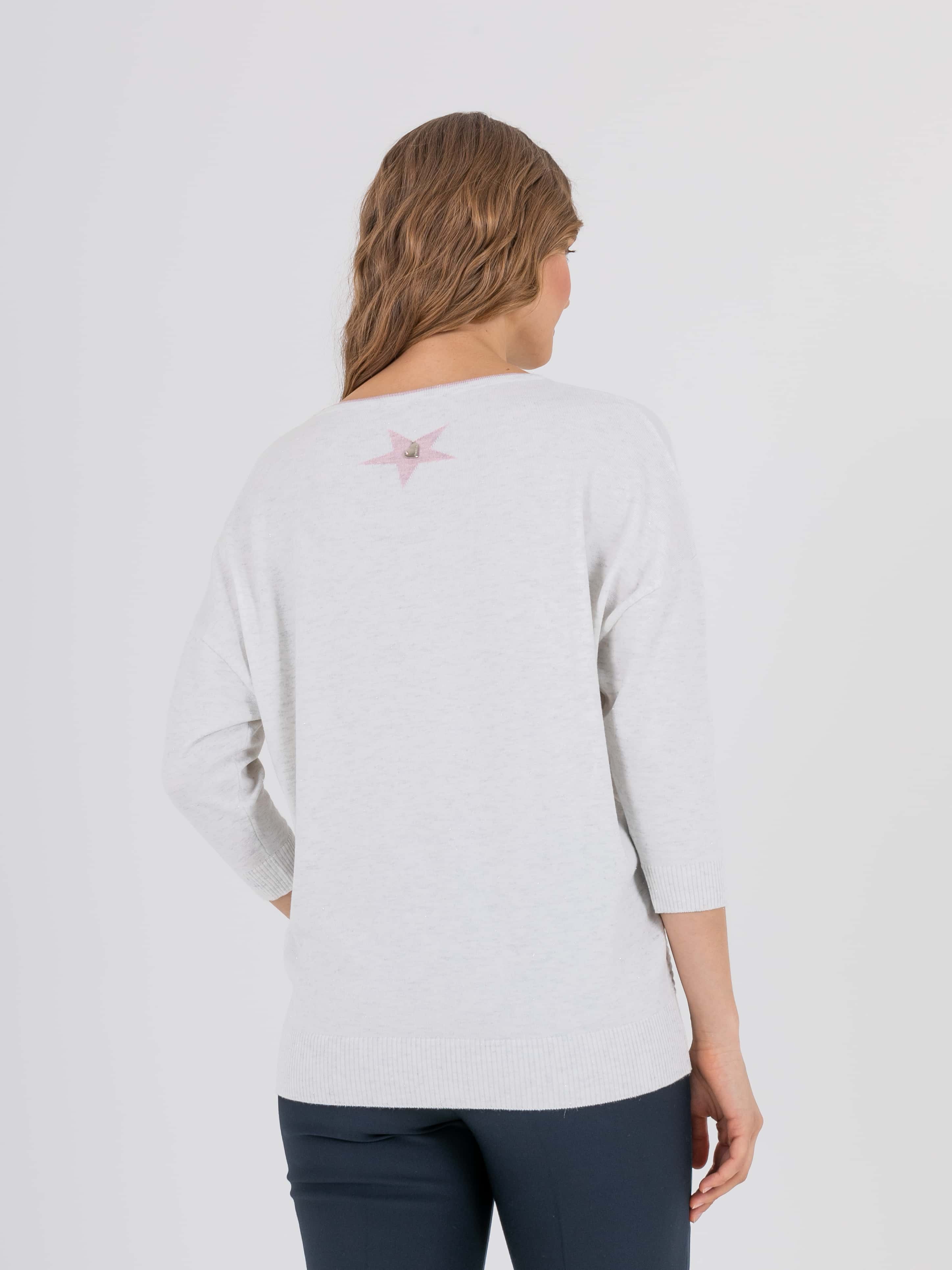 Джемпер прямого силуэта средней длины из мягкой вискозы с добавлением эластана и люрекса. Перед и спинка по низу обработаны манжетой. Перед выполнен из фактурного трикотажа. По спинке расположен нежный рисунок в виде звезды. Рукава втачные ¾ со спущенной линией плеча и манжетами. Круглый вырез горловины.