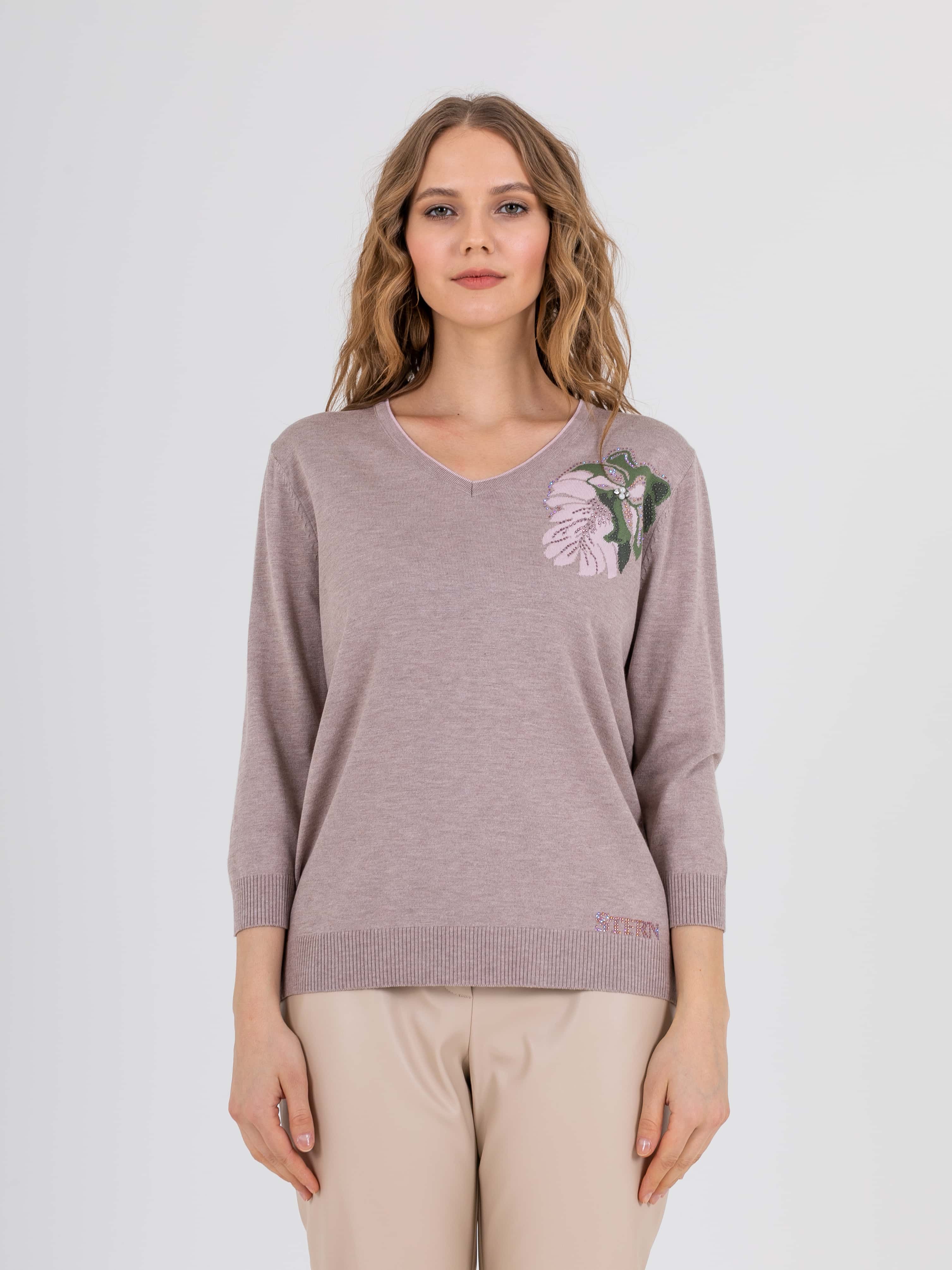 Джемпер средней длины прямого силуэта из мягкой вискозы с добавлением эластана. Перед и спинка по низу обработаны манжетой. По переду выполнен нежный тропический рисунок со стразами. Удлиненные втачные рукава со спущенной линией плеча и манжетами. V–образный вырез горловины.