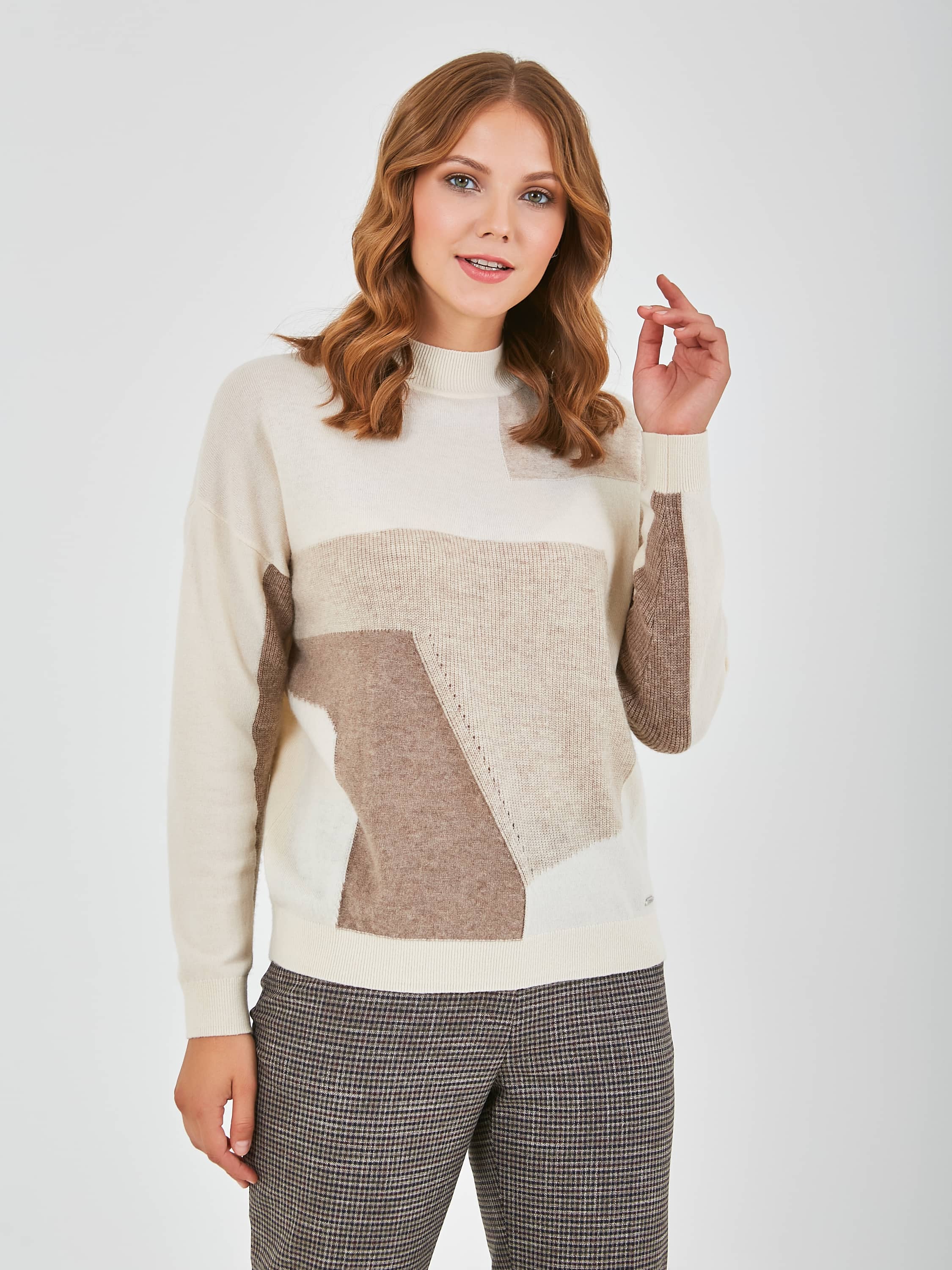 Джемпер средней длины прямого силуэта из мягкой шерсти с добавлением полиэстера и нейлона, дизайнерская особенность модели – геометрический рисунок и перфорированный трикотаж. Перед и спинка по низу обработаны манжетой. Длинные втачные рукава со спущенной линией плеча и манжетами. Воротник стойка.