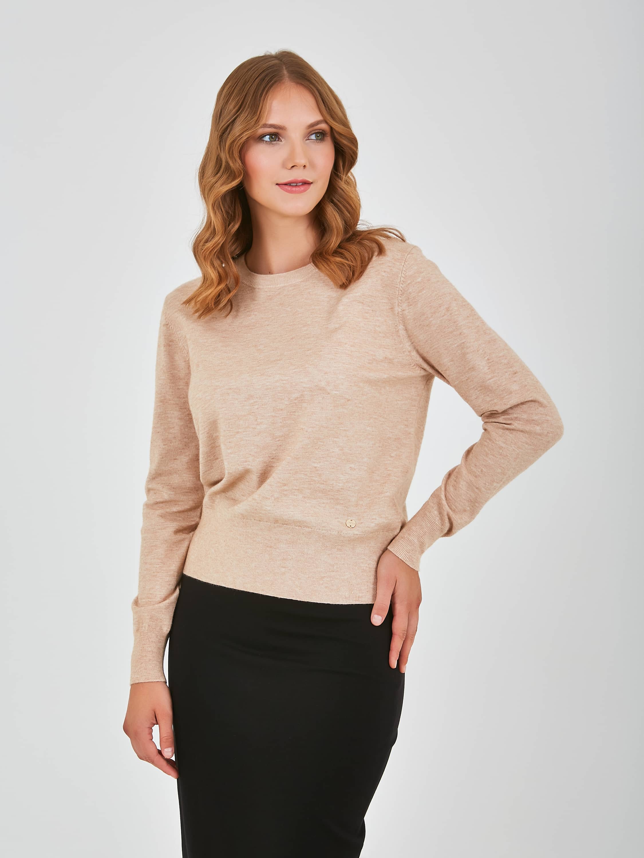 Джемпер средней длины прямого силуэта из мягкой вискозы с добавлением полиэстера и нейлона. Перед и спинка по низу обработаны манжетой. Длинные втачные рукава с манжетами. Круглый вырез горловины.