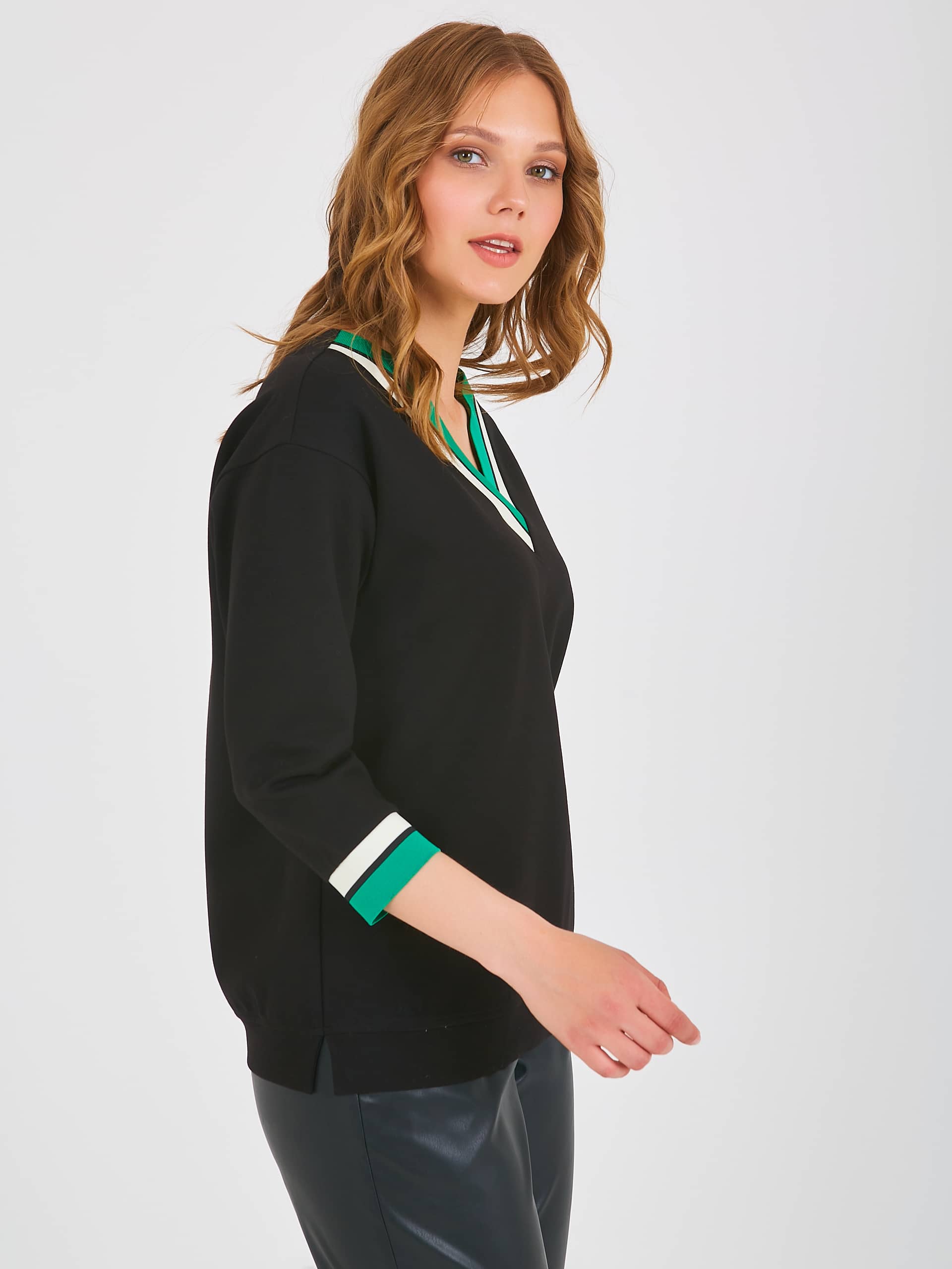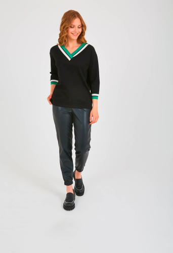 Джемпер средней длины прямого силуэта из мягкой вискозы с добавлением нейлона и лайкры, дизайнерская особенность модели – контрастный геометрический рисунок на манжетах и горловине по переду. Перед и спинка по низу обработаны манжетой с боковыми разрезами. Втачные рукава 3/4 со спущенной линией плеча с манжетами. V-образный вырез горловины.