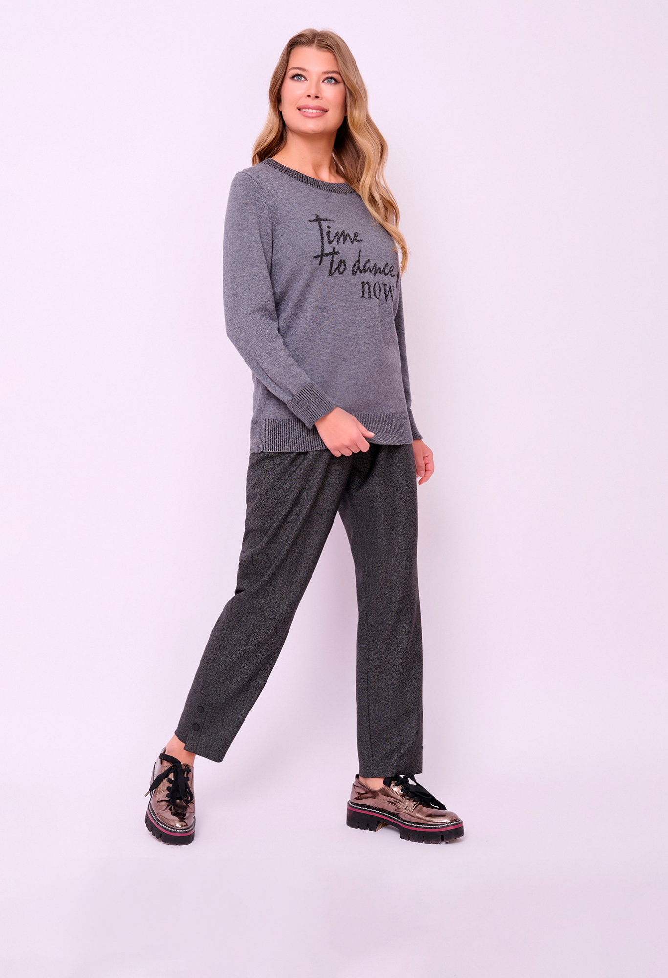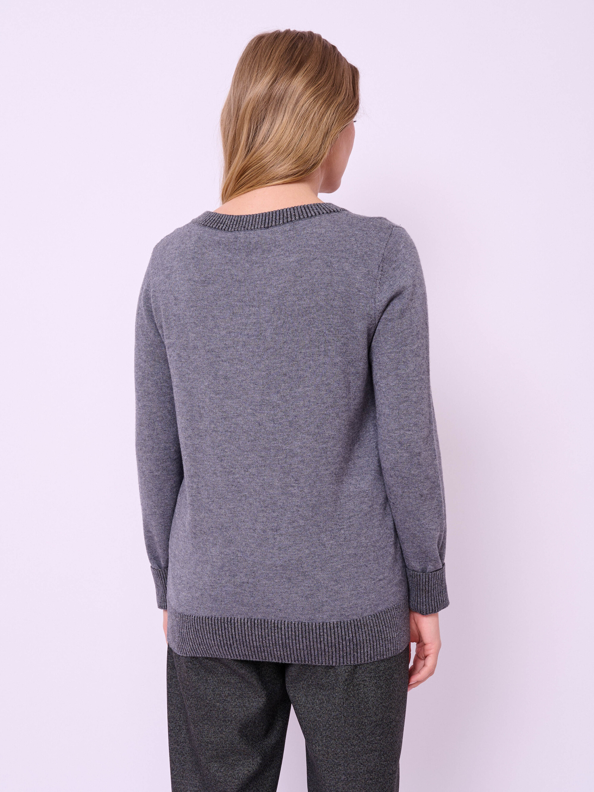 Джемпер трикотажный из смесовой шерсти прямого покроя с округлой горловиной, длинными рукавами и надписью из люрекса на груди. Длина по спинке: 66 см