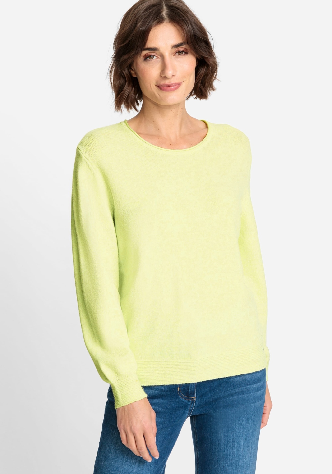 Cвитер из мягкой пряжи с меланжевым эффектом. Низ и манжеты отделаны тонкой ребристой вязкой. Рукава немного шире. Джемпер скроен прямо и слегка прилегает к телу.