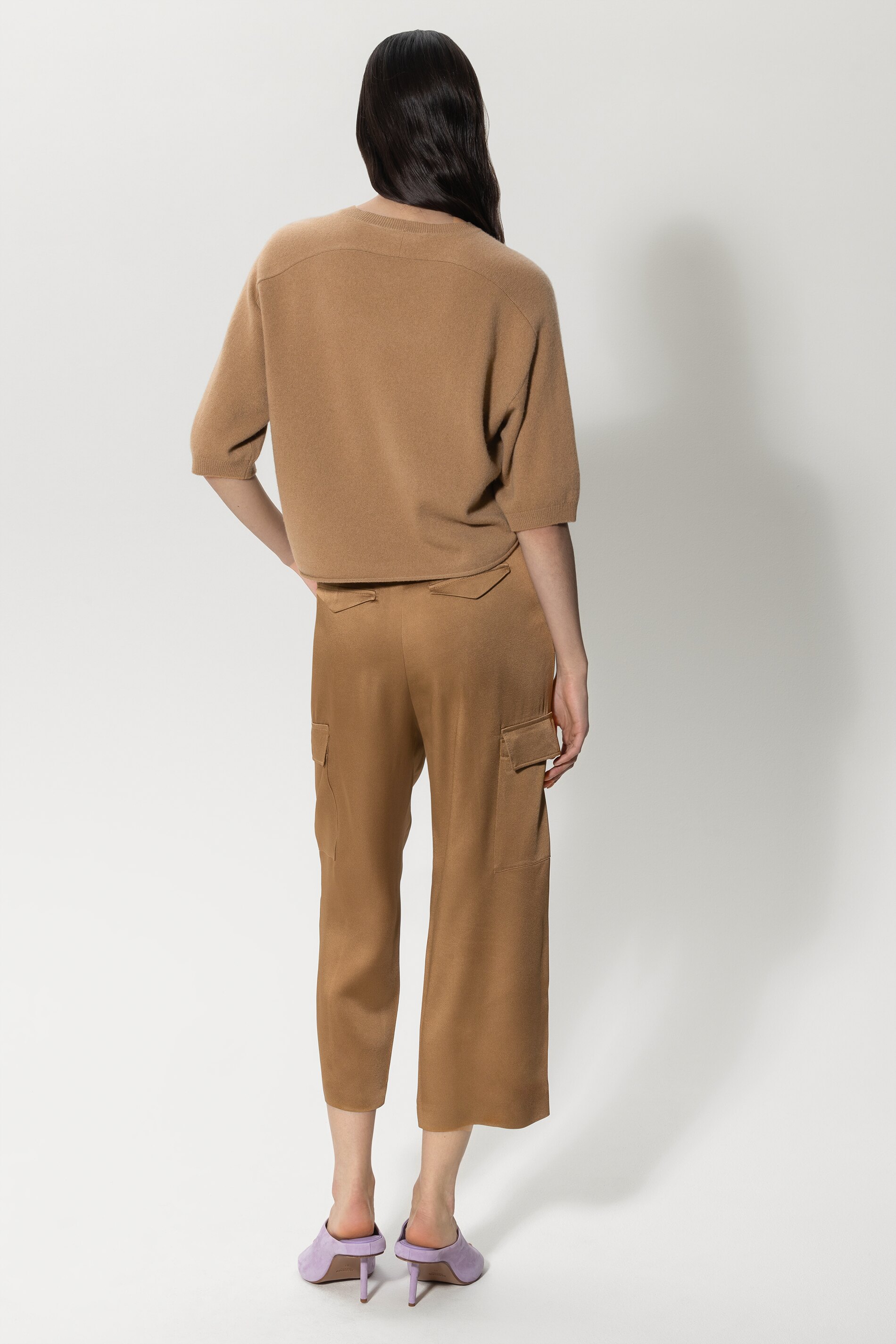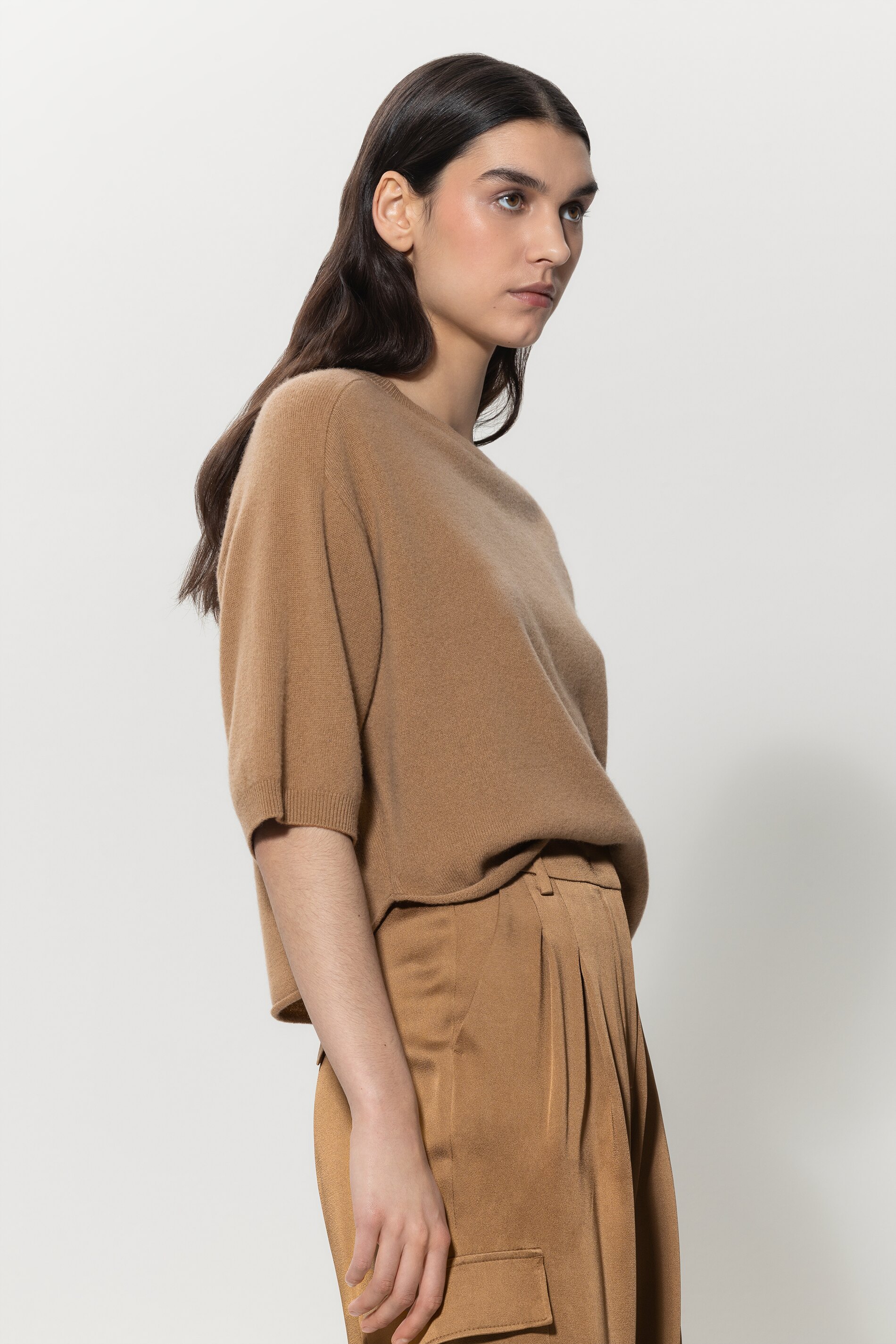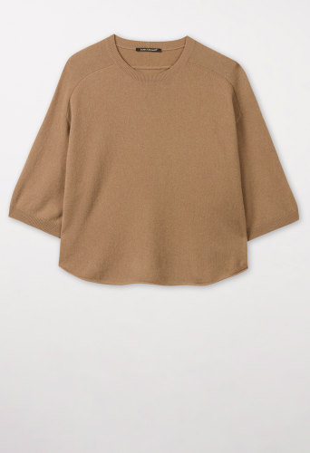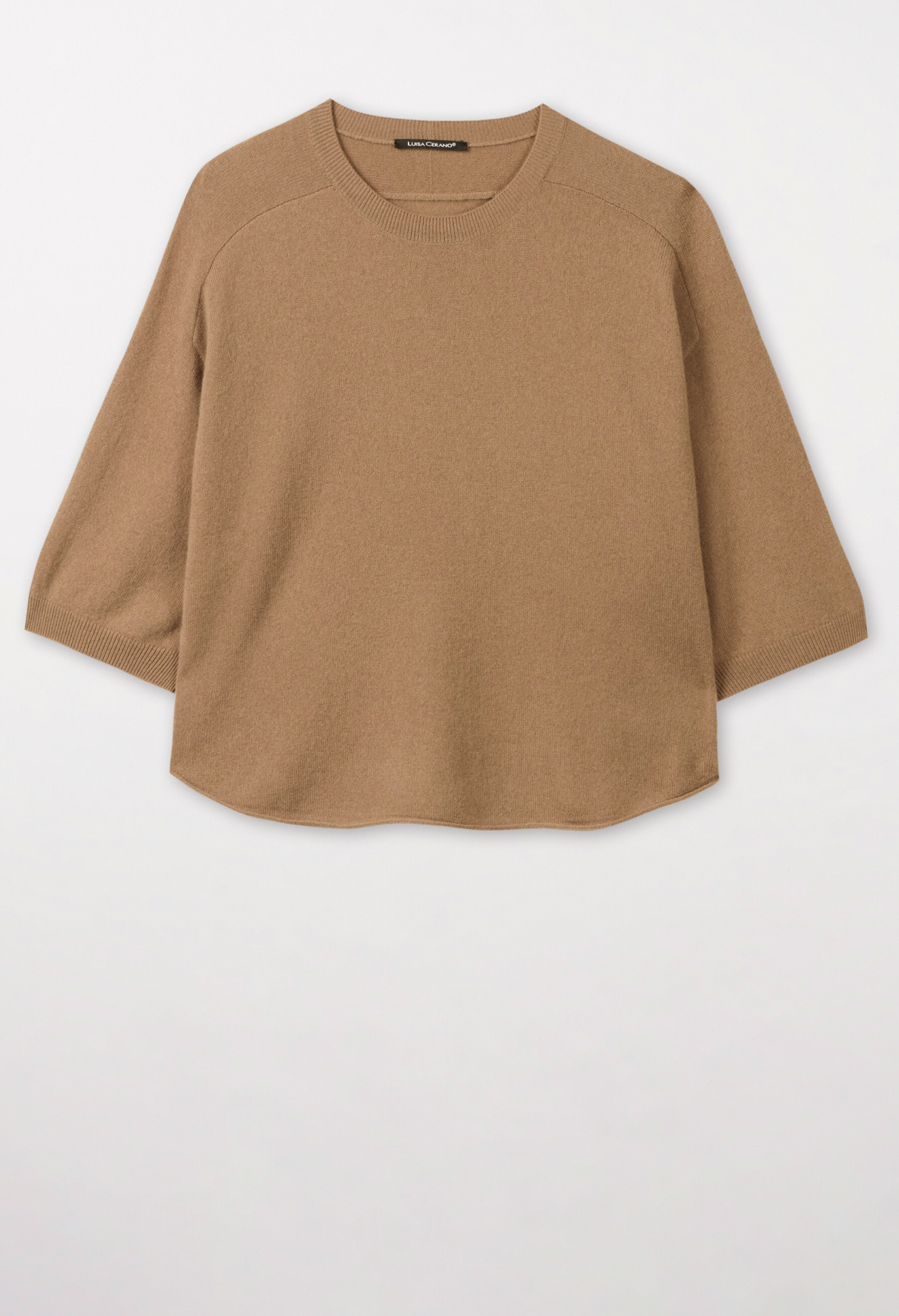 Трикотажный джемпер с рукавами средней длины из роскошного смесового кашемира. Изысканный дизайн швов и закругленный низ придают этому джемперу элегантный и эффектный вид.