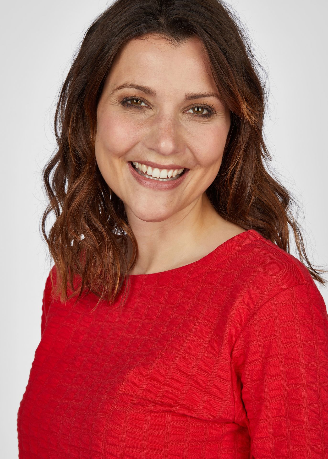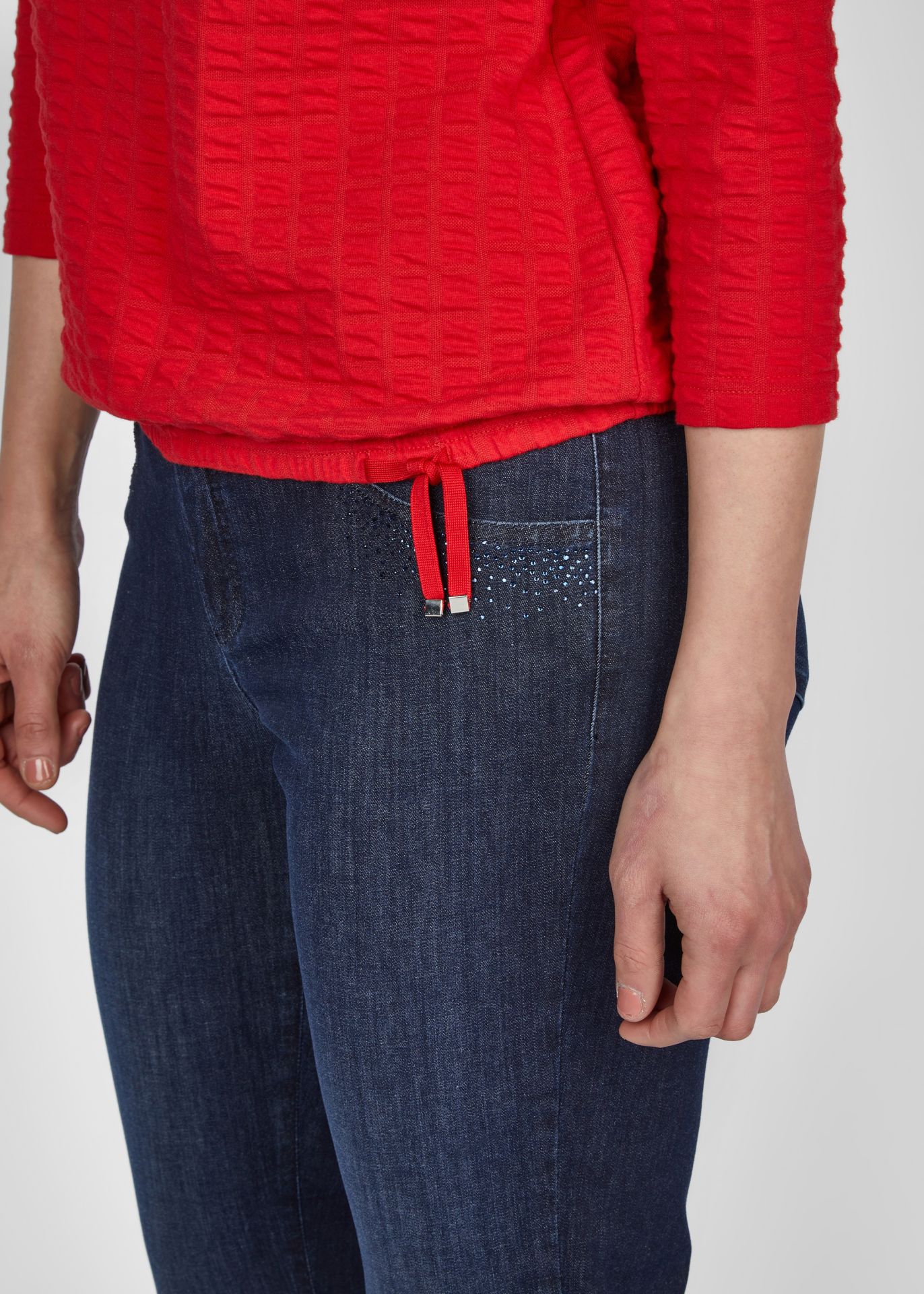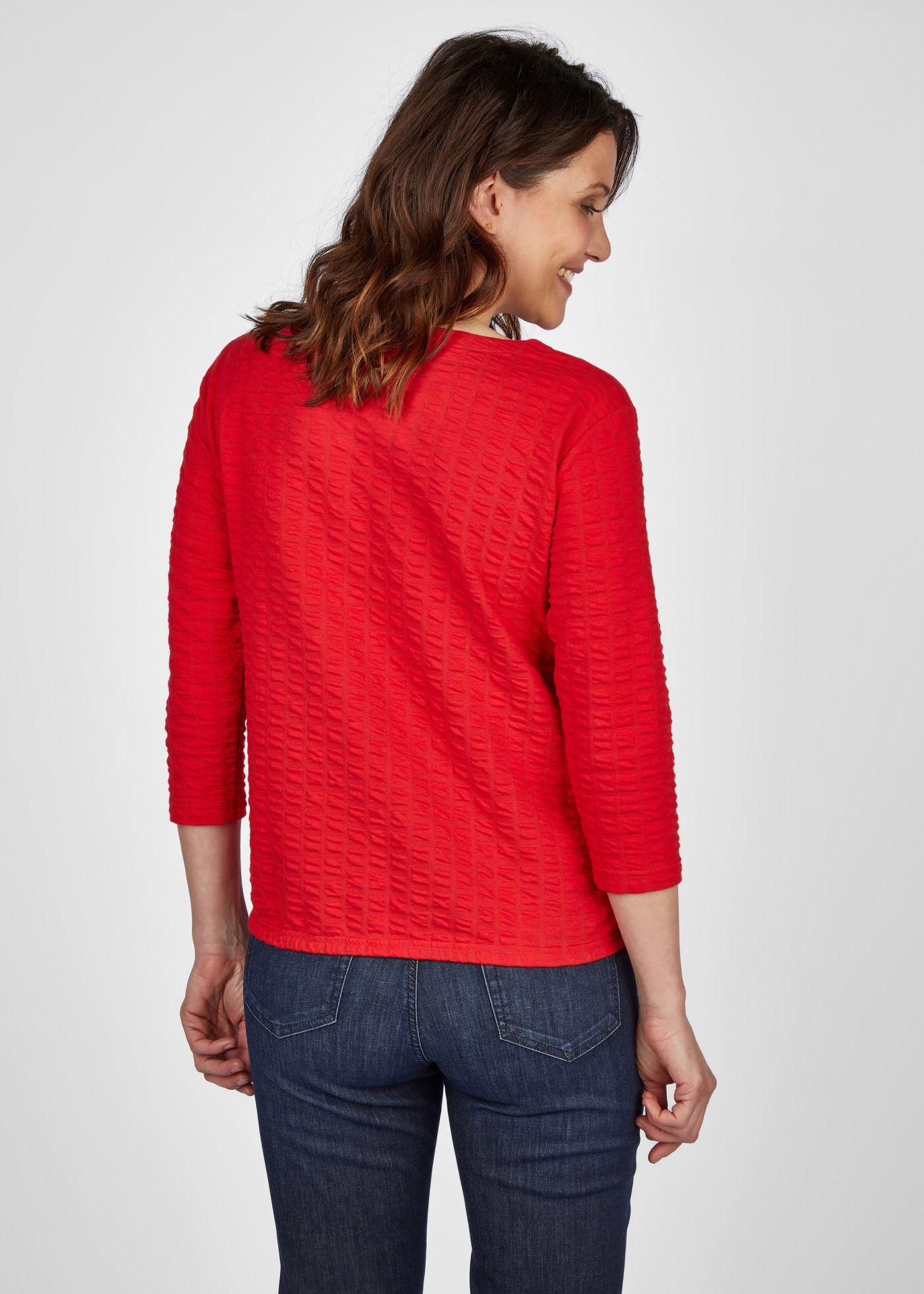 Универсальный однотонный джемпер с круглым вырезом! Этот стильный джемпер идеально подходит для любого случая и имеет удобный рукав длиной 3/4. Петли по нижнему краю придают джемперу особый вид, а структурированный материал гарантирует привлекательный вид. Прямая посадка обеспечивает оптимальную и удобную посадку. Длина спинки от плеча для 44 размера: 62см.