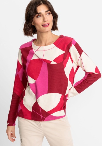 Трикотажный джемпер из джерси в рубчик украшен геометрическим узором по всей поверхности, напоминающим 70-е годы в ярких тонах. Детали включают небольшие боковые разрезы и завязки на закругленном вырезе. Модель Henny имеет прямой крой и слегка прилегает к телу.