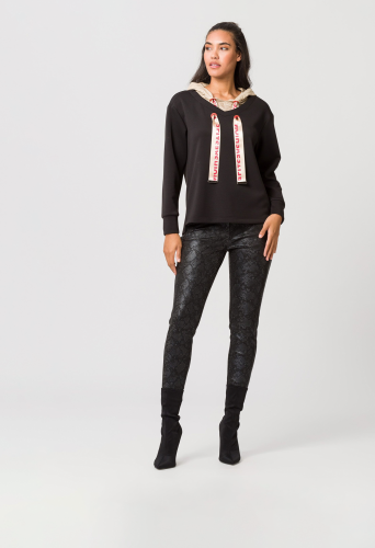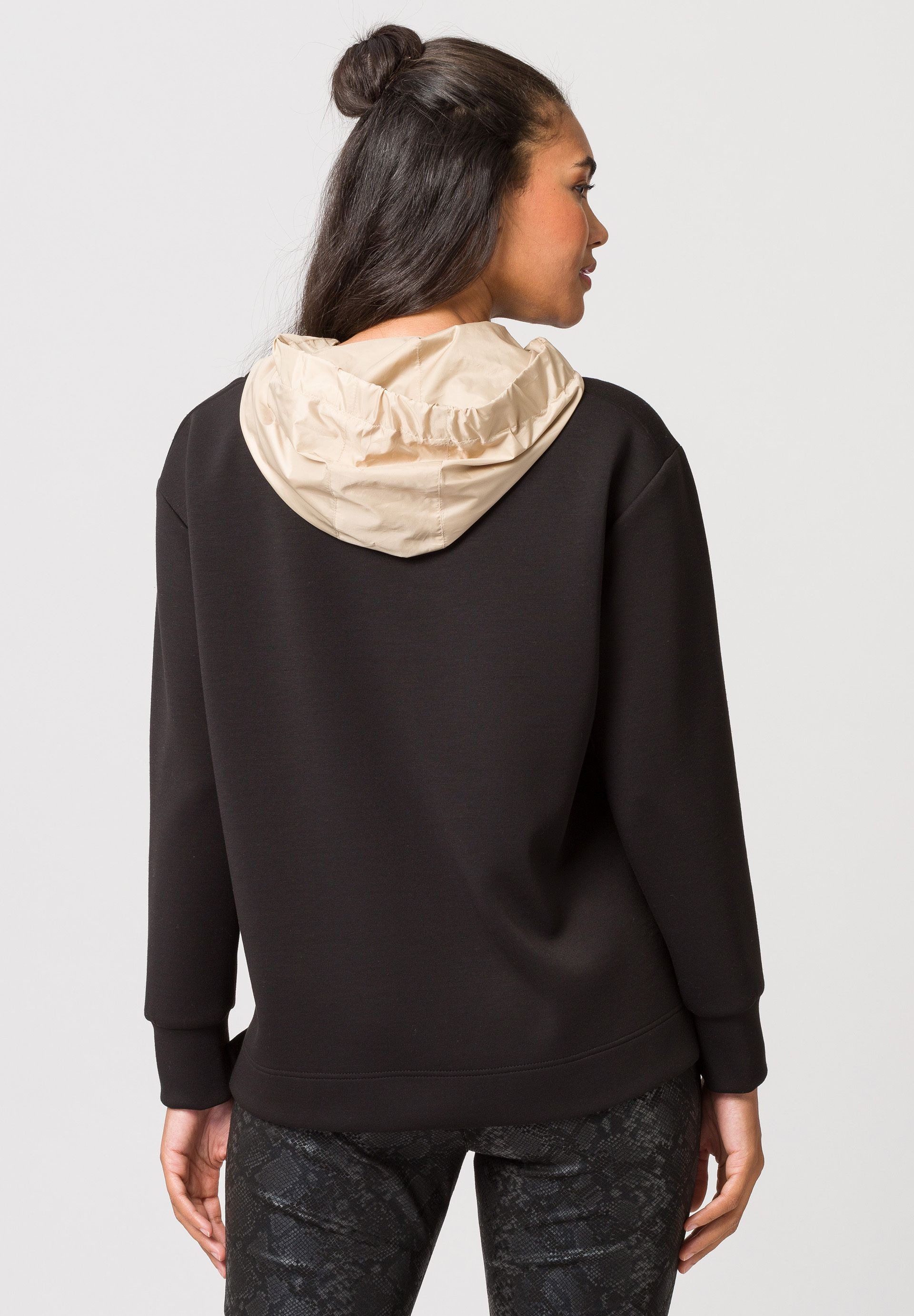 Женский пуловер с капюшоном и эффектной кулиской. Это отличная основа для ярких городских образов. Простой свитер из очень мягкого трикотажа имеет минималистичный дизайн, дополненный стильным капюшоном. Он выделяется, с одной стороны, матовой блестящей тканью, но, прежде всего, заметно широкими и классными бретелями на шнурке с принтом. Они продеваются через две пары петель соответствующего цвета. Эксклюзивный дизайн, непревзойденный комфорт в ношении – этот свитер просто незаменим!