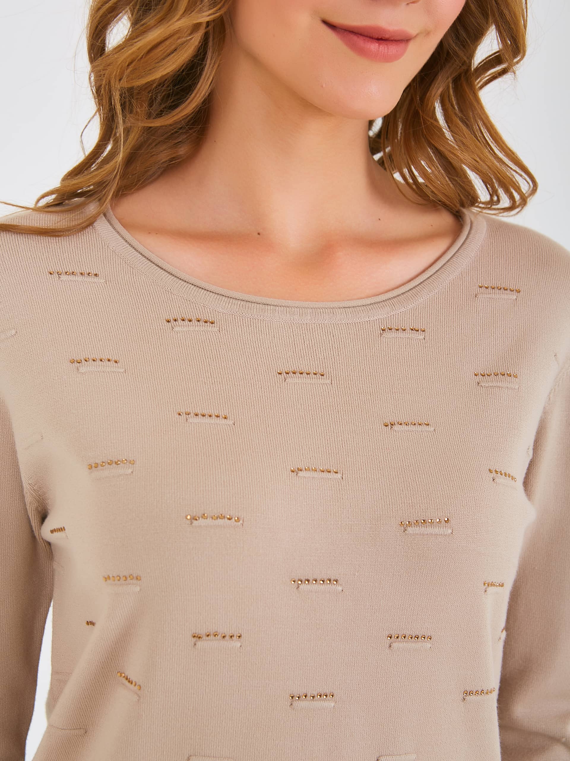 Cветло-бежевый джемпер c круглым вырезом. Поверхность изделия украшена небольшими горизонтальными полосками, которые подчеркнуты полосой из страз. Мягкий натуральный состав материала обеспечивает комфорт и тепло в прохладное время года.Осень-Зима'25/26. Капсула "Вино из одуванчиков"