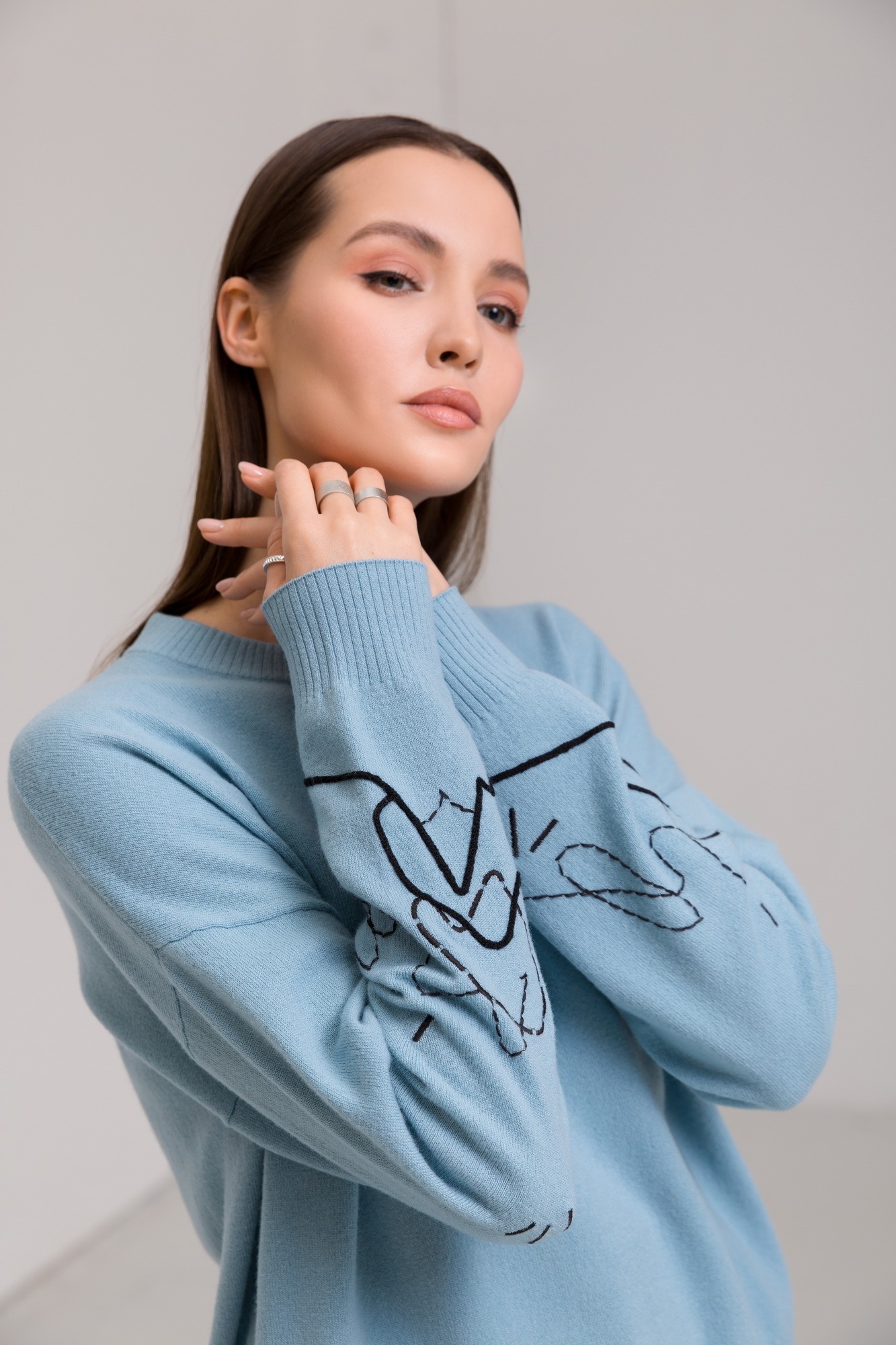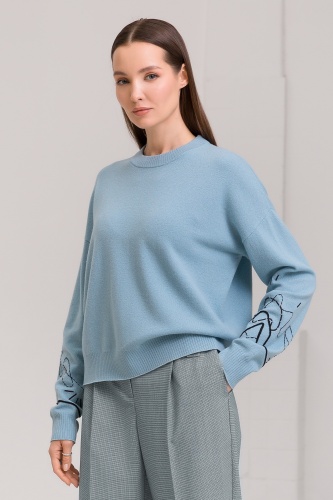 Шерстяной пуловер с изящной абстрактной вышивкой на рукавах.
