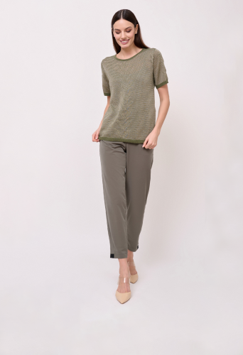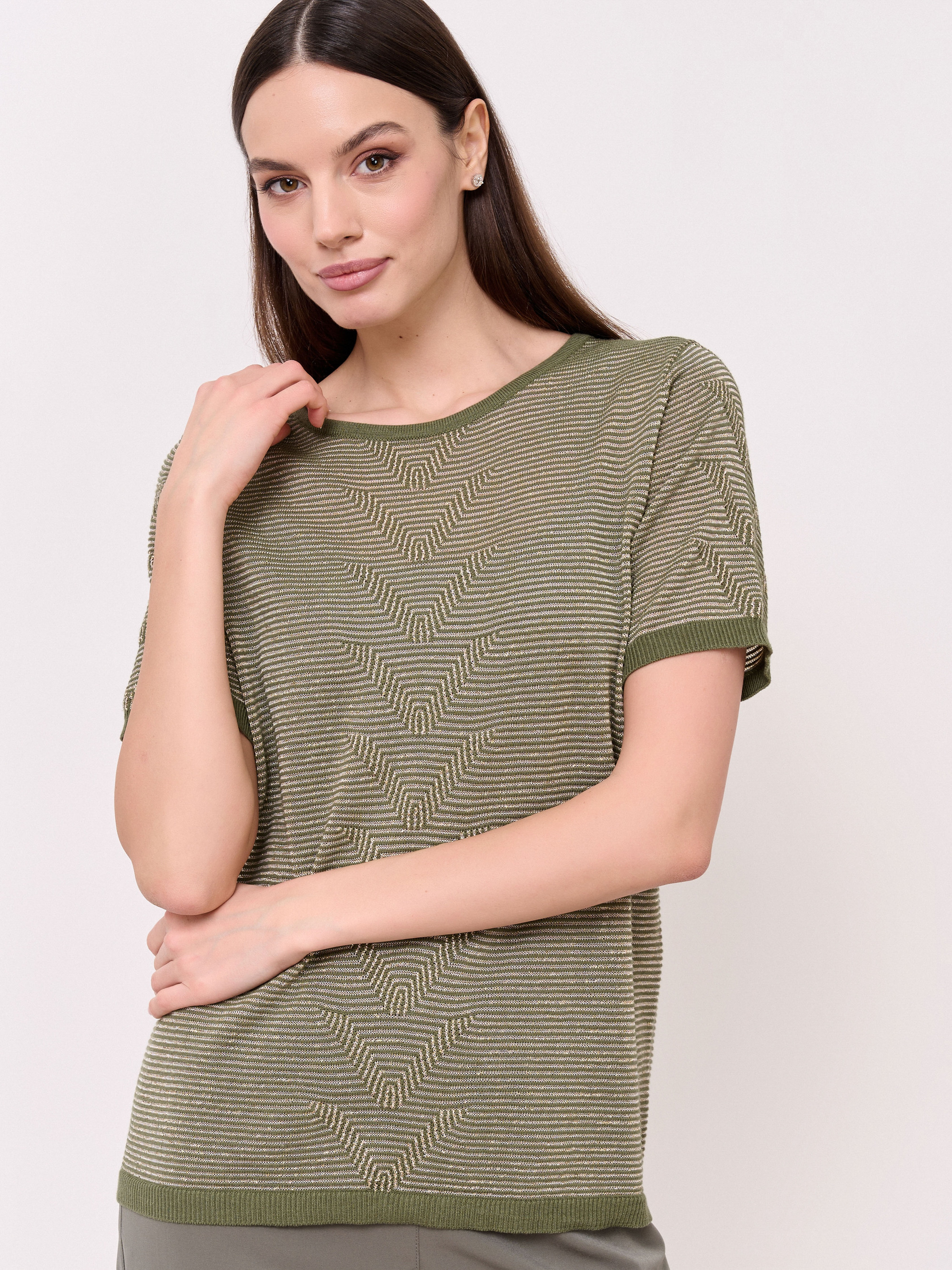 Детали: вырез горловины округлый, рукава короткие, покрой прямой, рисунок полоска, люрекс. Длина по спинке: 62 см.