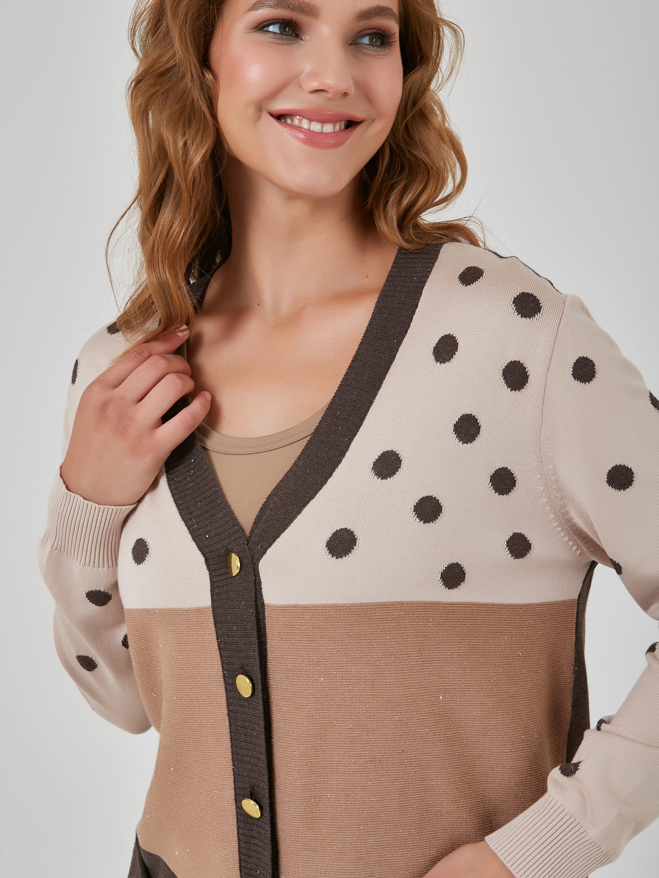 Уютный кардиган в теплых кофейных тонах с накладными карманами и широкой резинкой по низу.