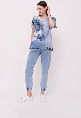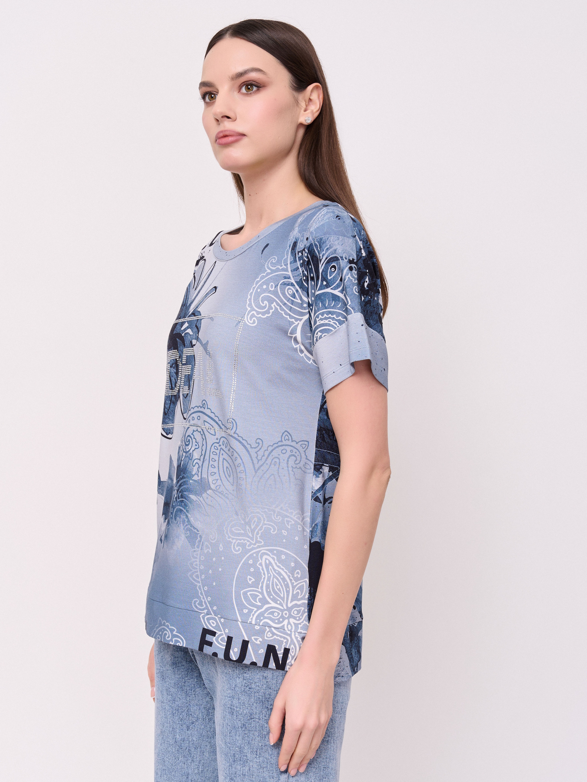 Детали: вырез горловины округлый, рукава короткие, покрой прямой, рисунок цветы и растения, стразы, боковые разрезы. Длина по спинке: 60 см.
