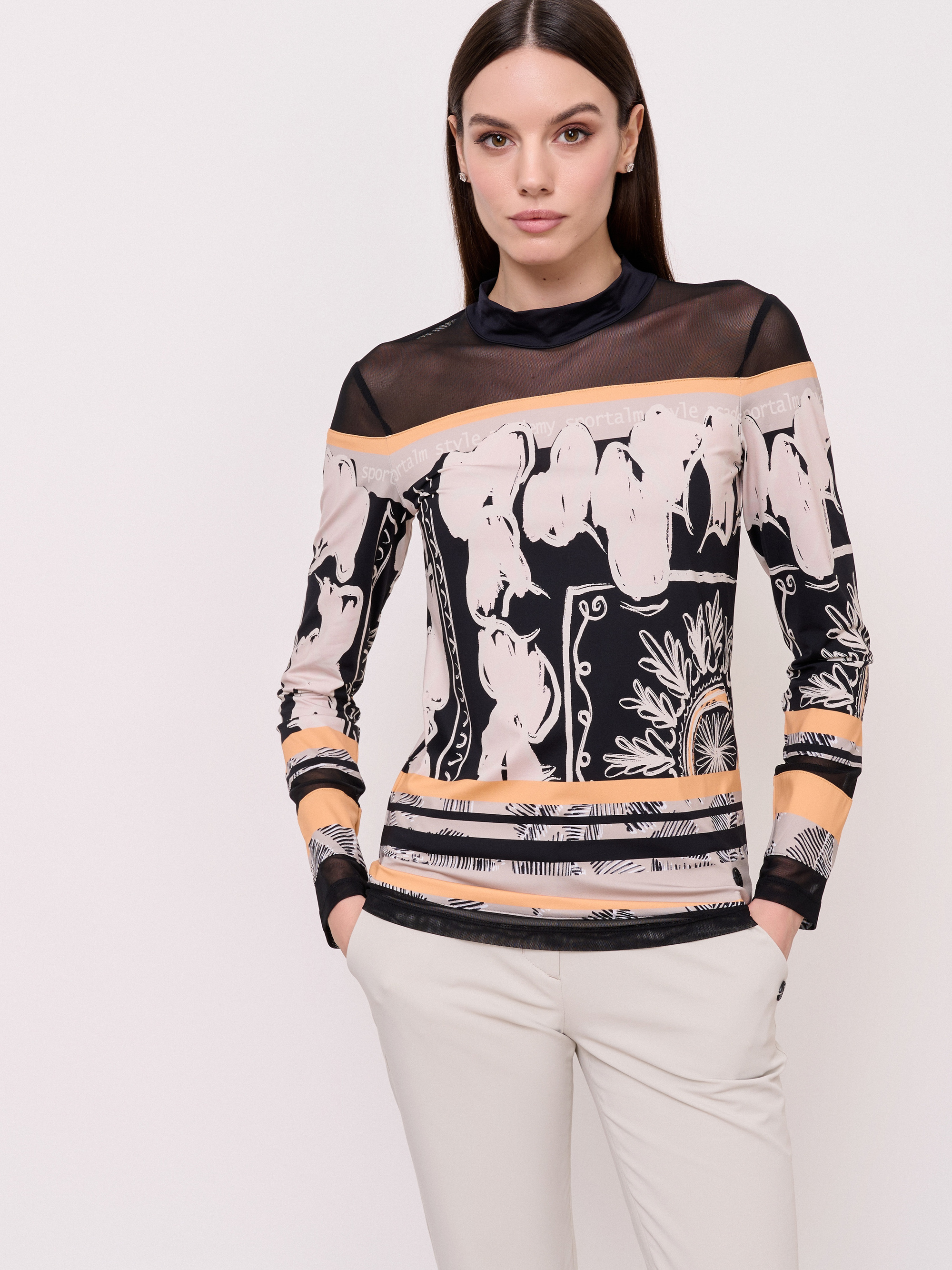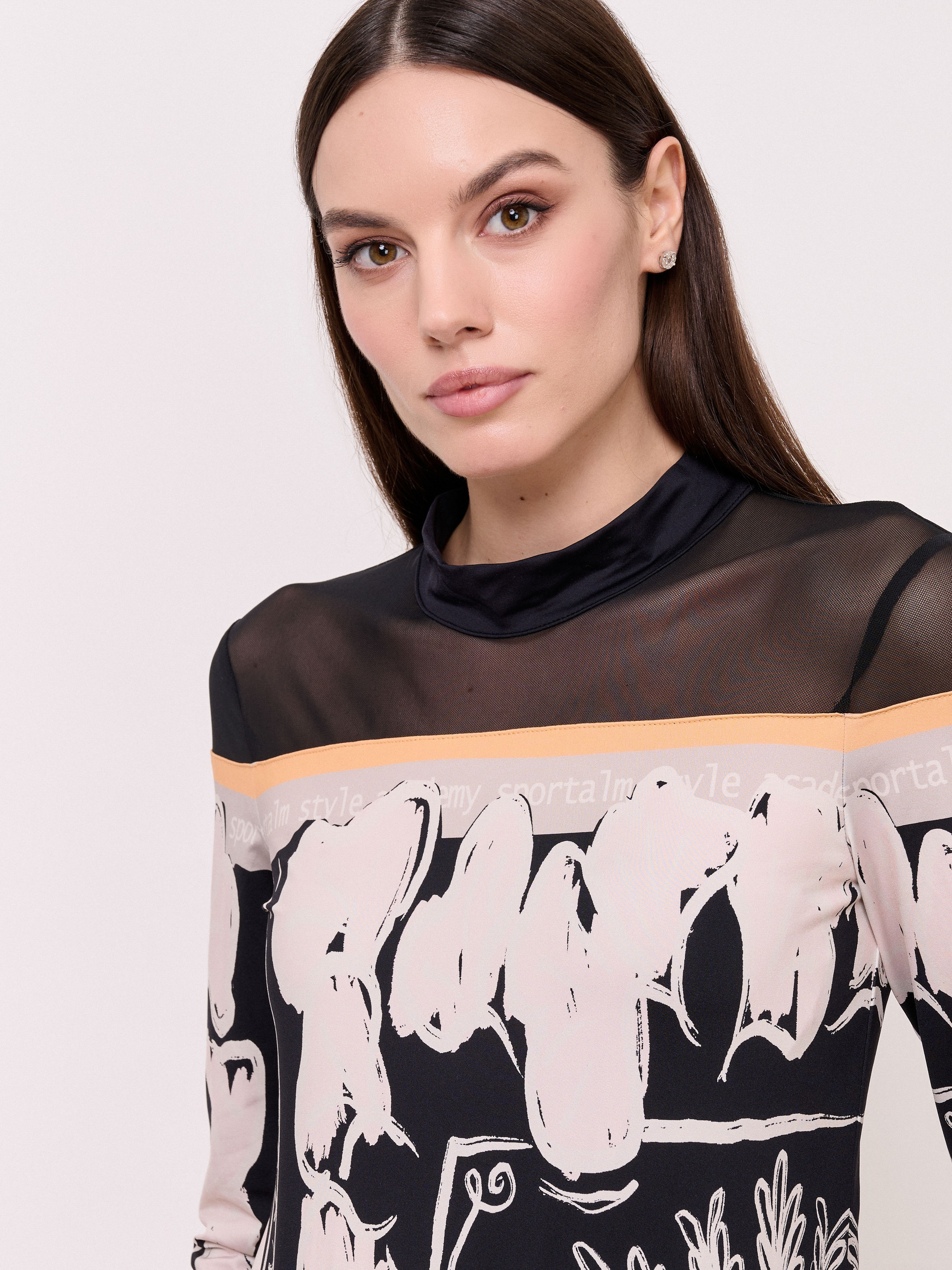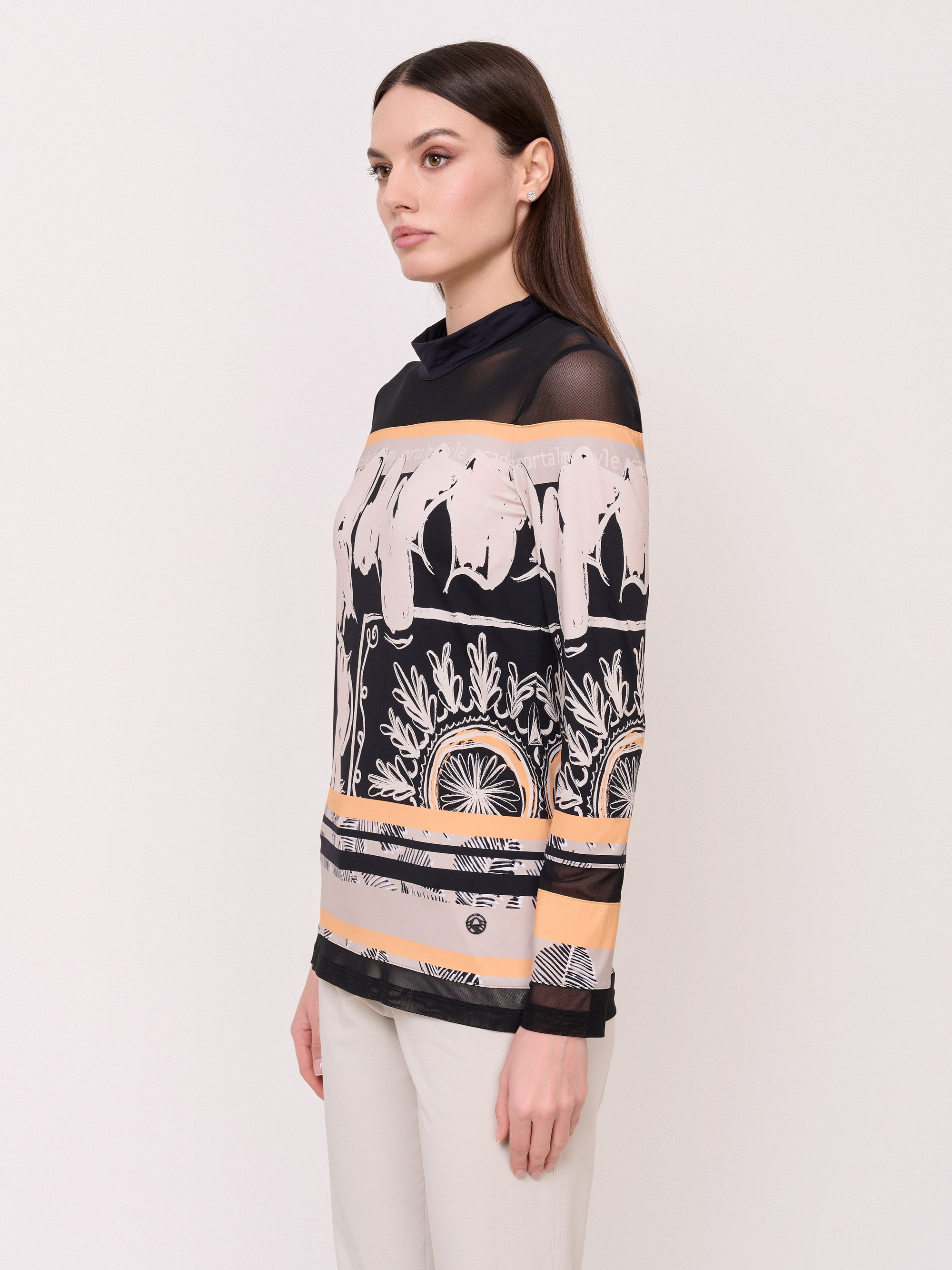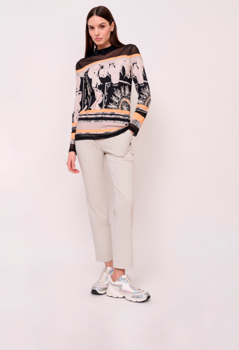 Детали: вырез горловины воротник-стойка, рукава длинные, покрой полуприталенный, рисунок абстракция. Длина по спинке: 65 см.