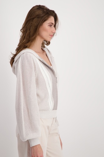 Кардиган с люрексом в цветных блоках из высококачественного хлопка с ажурным узором и полосками со стразами. Регулярная посадка. Капюшон. Широкие длинные рукава. Ребристые манжеты и подол. Двусторонняя молния. Длина 44 размера — 56 см.