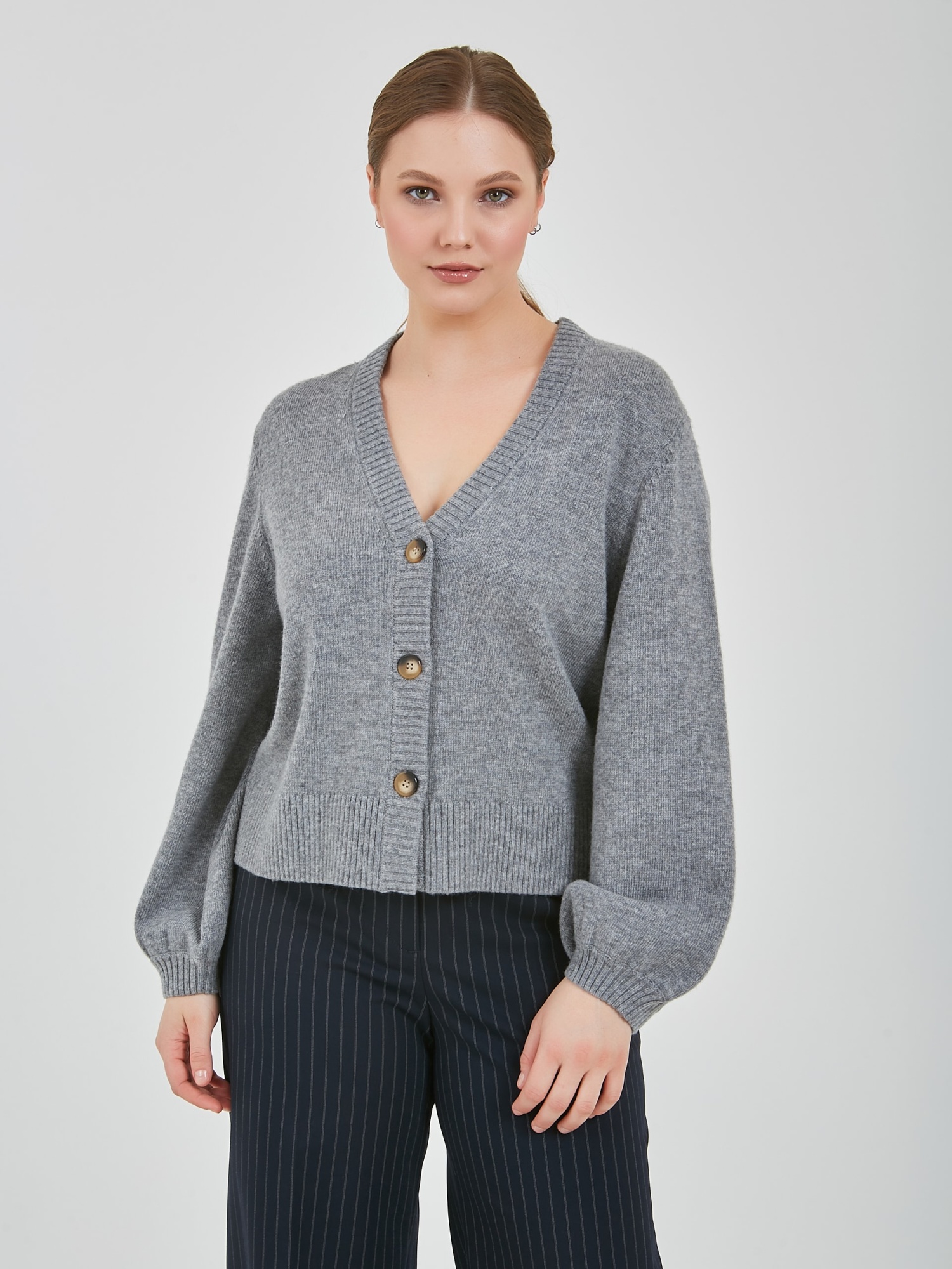Кардиган в светло-сером цвете с глубоким V-образным вырезом зрительно вытягивает силуэт. Акцентные пугововицы и расширяющийся книзу рукав добавит к образу изюминку.Осень-Зима'25/26. Капсула "Вишневый сад"