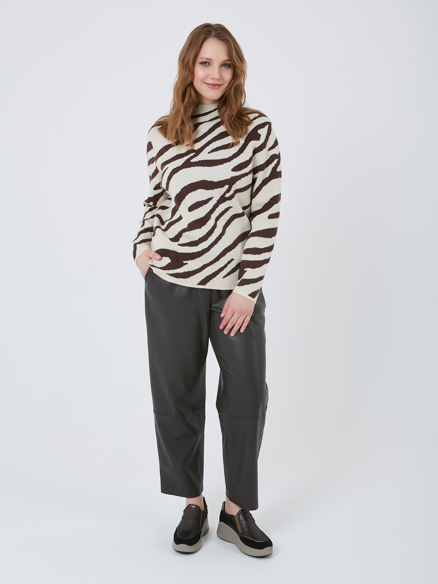 Уютный мягкий трикотажный джемпер с коричневым диагональным зебровым принтом. Осень-Зима'25/26. Капсула "Хозяйка медной горы"