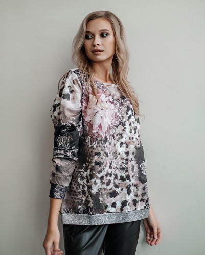 Сочетание анималистичного и цветочного дизайна для создания женственного и яркого образа. Состав из смесового хлопка обеспечит комфортное ношение. Украшение в виде декоративной ленты по низу изделия. Втачной рукав полной длины с манжетой.