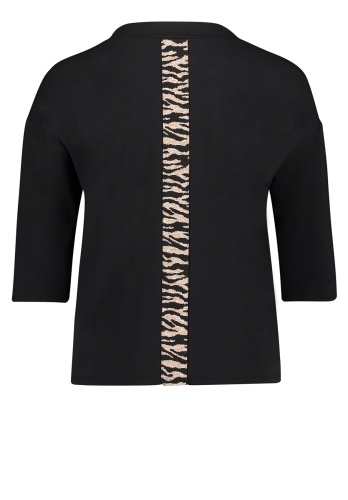 Джемпер прямого покроя. Рукава 3/4 со спущенным плечом, воротник с завязками. Перед изделия декорирован металлизированным принтом. Контрастная вставка с анималистическим принтом на спинке. Приятный эластичный материал из смеси хлопка и модала.