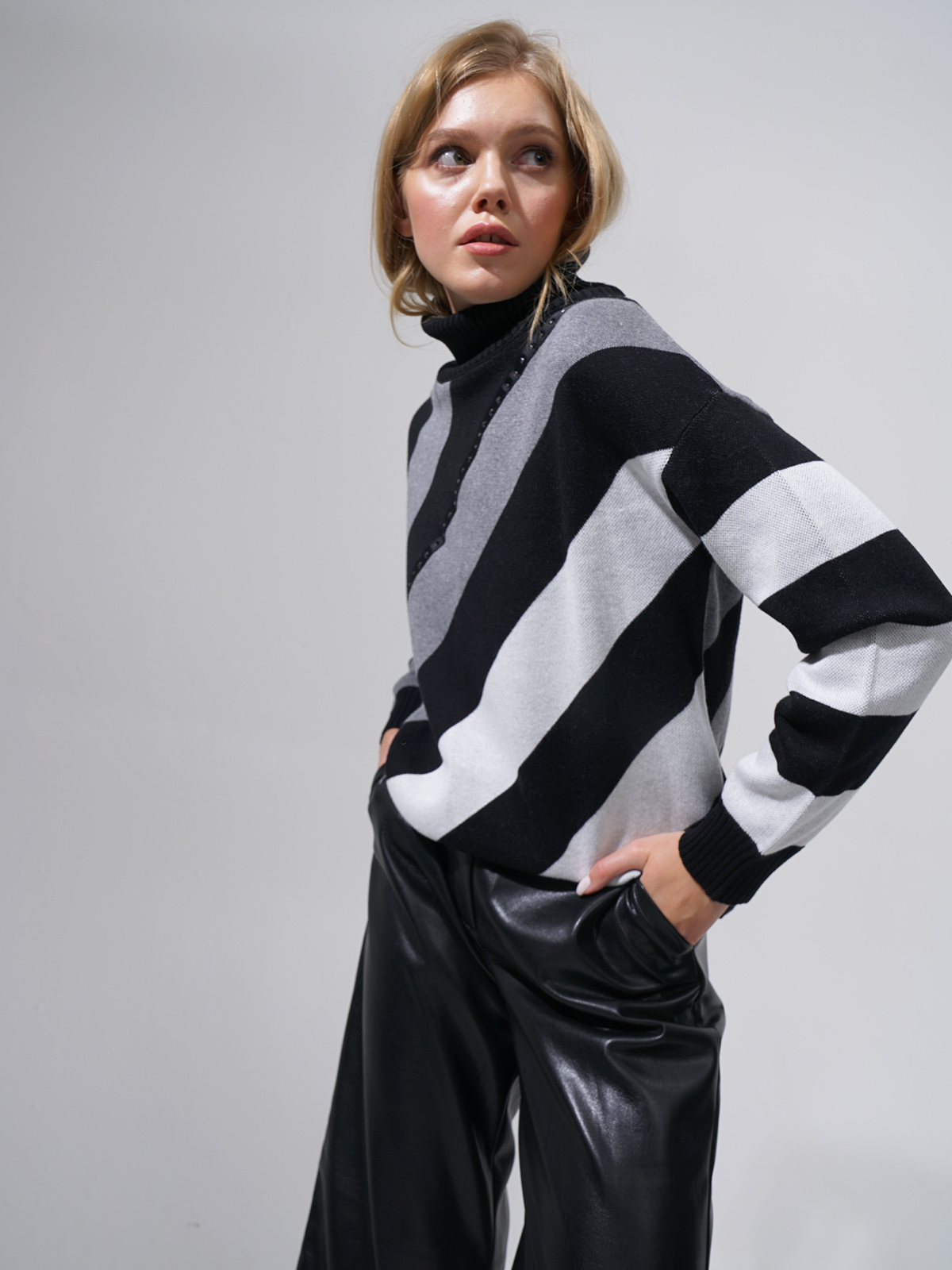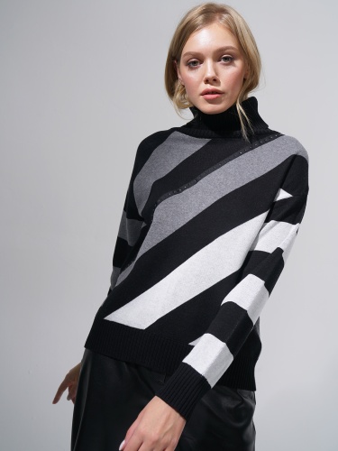 Теплый джемпер с широкими диагональными полосами. Базовое сочетание цветов разбавляется лаконичным декором в виде страз. Высокий воротник-стойка. Прямой крой подходит для любого типа фигуры.