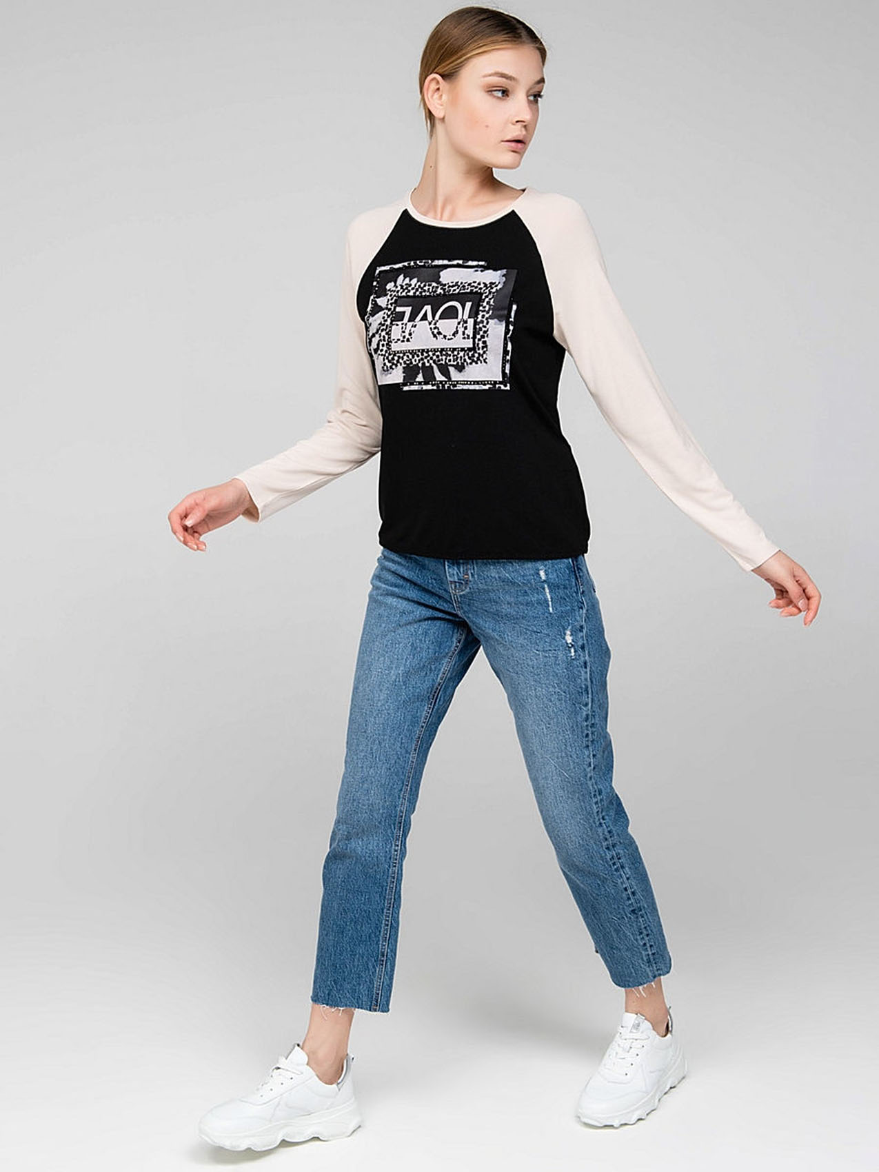 Джемпер с контрастным принтом. Полуприлегающий силуэт, круглый вырез горловины, длинные рукава реглан. Приятный к телу материал из смеси вискозы, полиэстера и эластана.