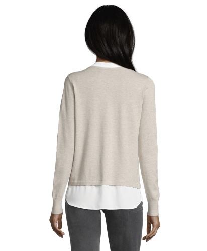 Джемпер с имитацией модели-двойки смотрится очень женственно и элегантно. Слегка прилегающий силуэт, V-образный вырез, длинные рукава. Материал из вискозной смеси приятен к телу и обеспечивает комфорт. В сочетании с брюками этот джемпер создает сдержанный образ в стиле смарт-кэжуал.