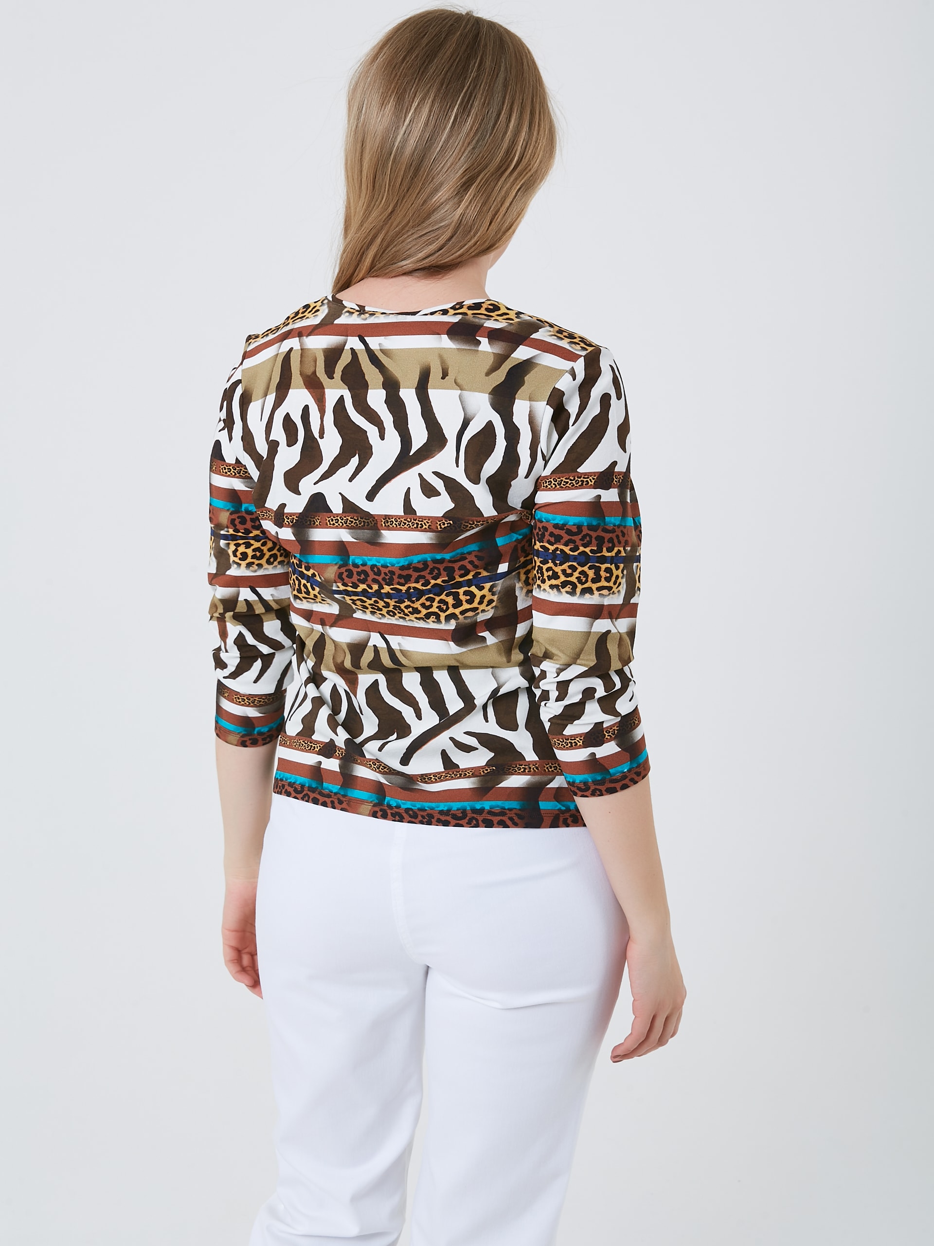 Лонгслив с рукавом 3/4, круглым вырезом и нетривиальным принтом собравшим все оттенки сафари. Коллекция Весна-Лето 2025. Капсула "Рио де Жанейро". Параметры модели: 89-70-92, рост 167, размер 44-46