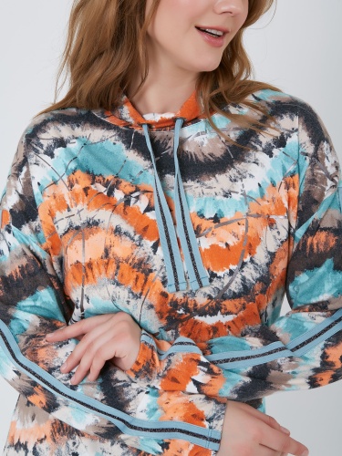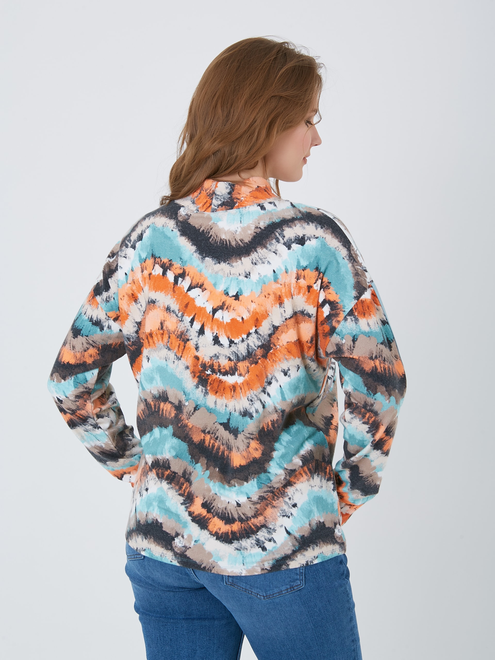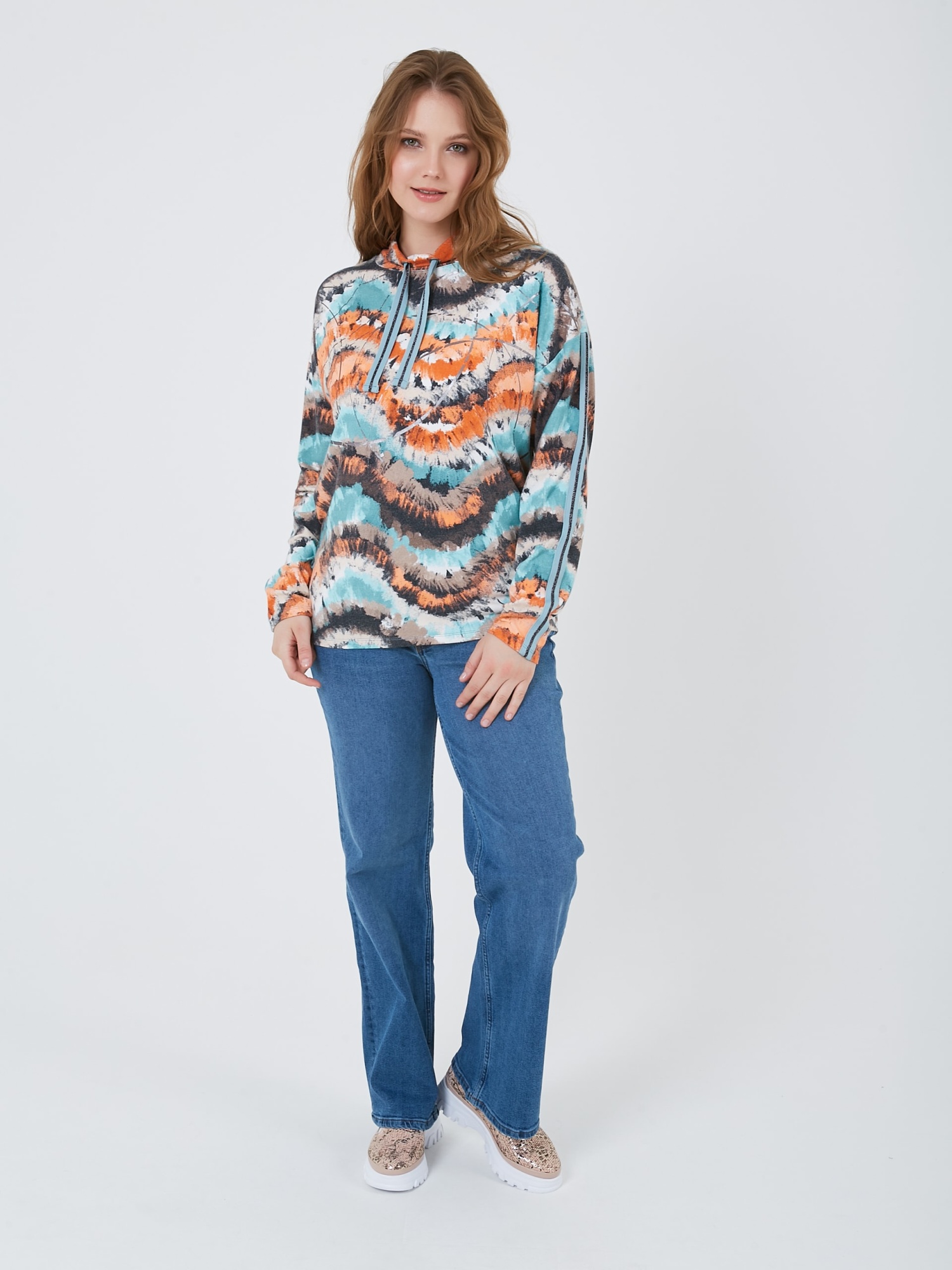 Принтованный лонгслив свободного кроя, обеспечивающий комфорт и свободу движений, с акцентными полосками на рукавах. Коллекция Весна-Лето 2025. Капсула "Санторини". Параметры модели: 95-64-101, рост 175, размер 44-46