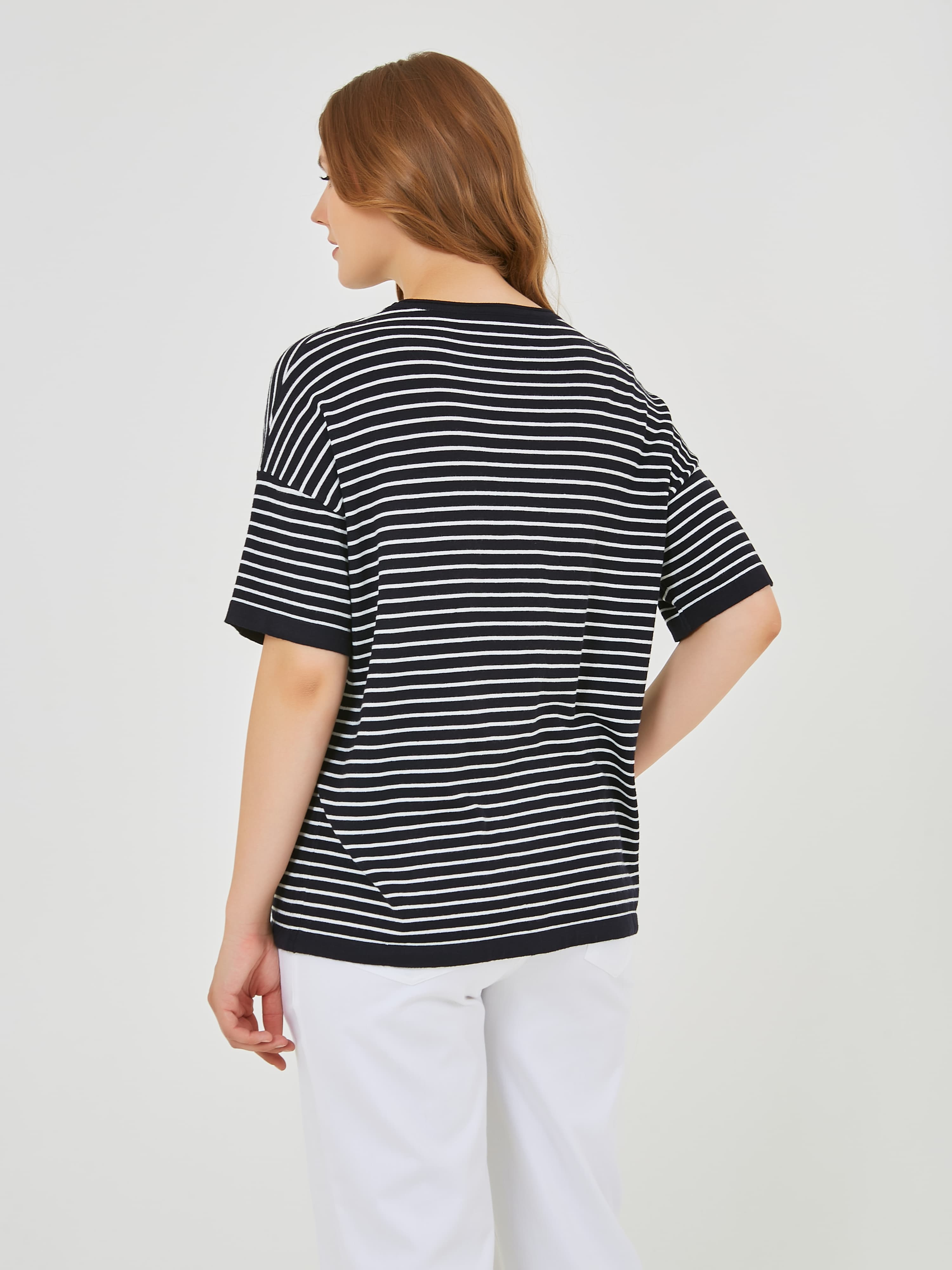 Джемпер в морскую полоску со спущенной линией плеча и кулиской по низу. Весна-Лето 2025. Капсула "Самарканд". Параметры модели: 95-64-101, рост 175, размер 44-46