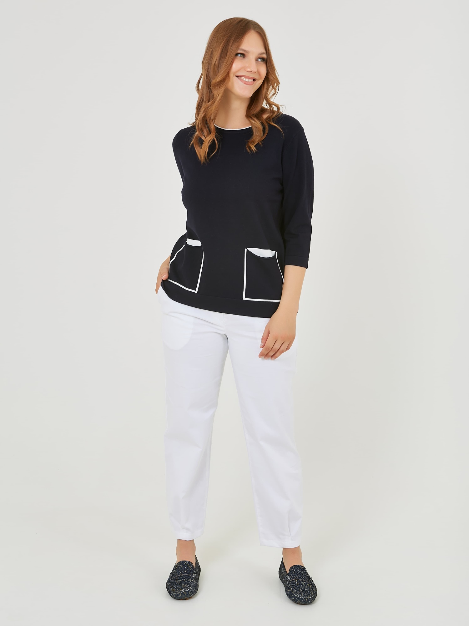 Джемпер с рукавом 3/4 и акцентными горловиной и карманами. Весна-Лето 2025. Капсула "Самарканд". Параметры модели: 95-64-101, рост 175, размер 44-46