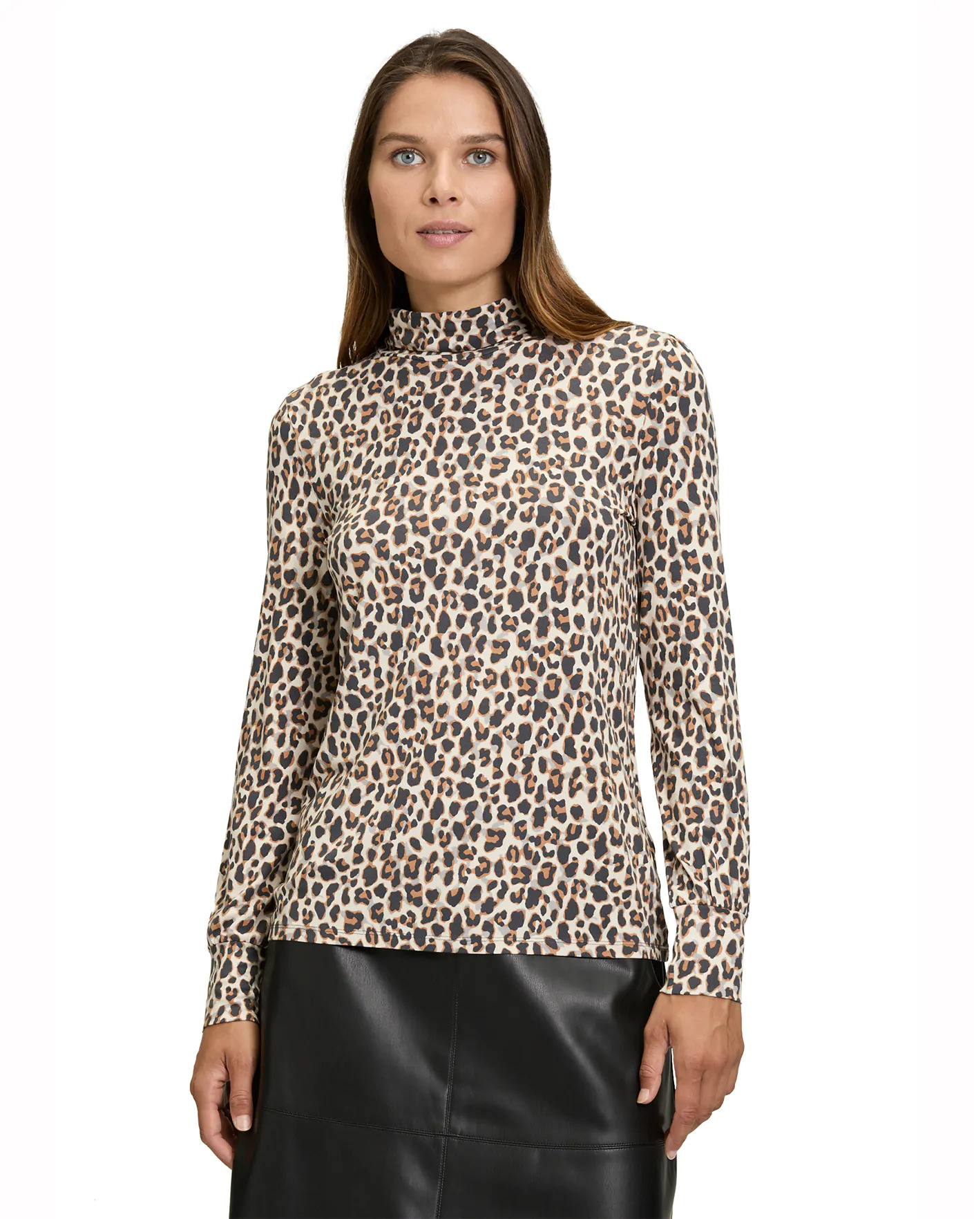 Приталенная водолазка бежевого цвета в леопардовый принт. Модель с воротником-стойкой и длинными рукавами с широкими манжетами.