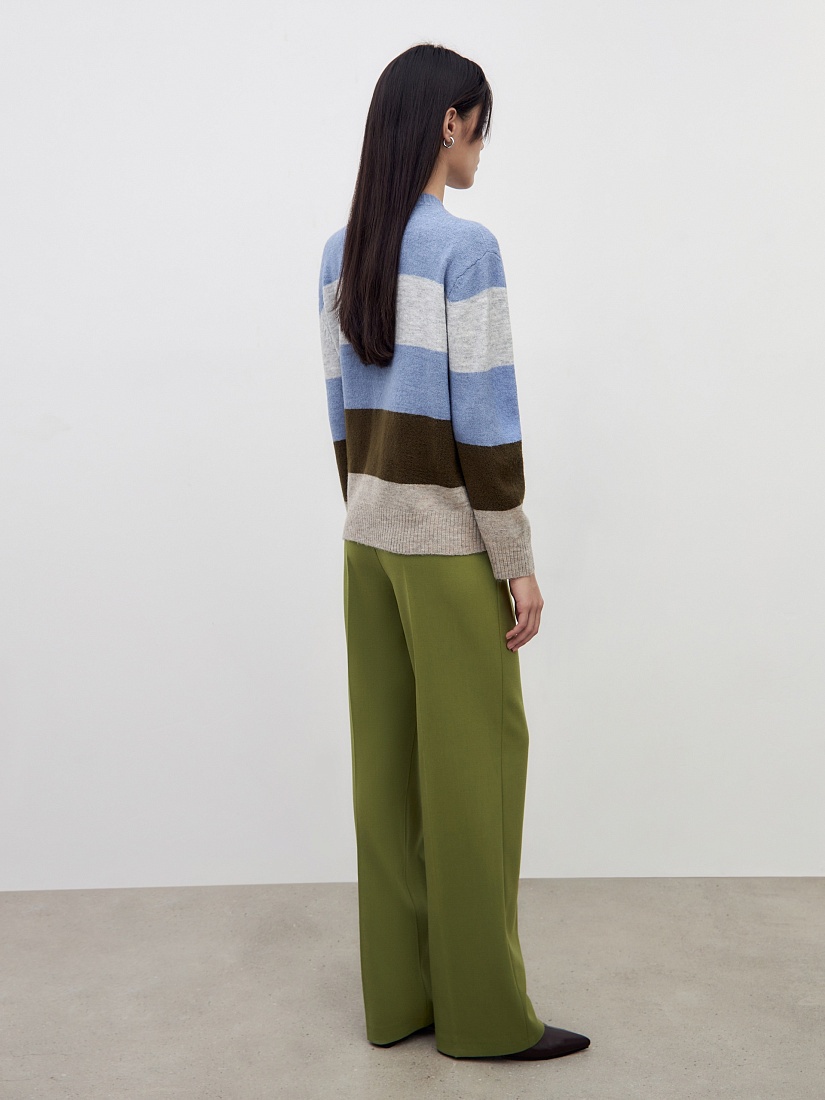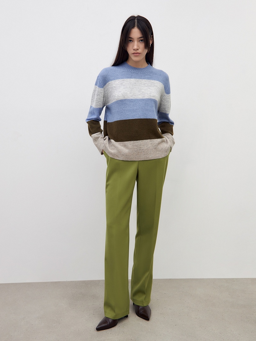 Уютный базовый свитер в полоску, круглый вырез горловины, рукав полной длины. Благодаря смесовомой композиции пряжи и содержанию овечьей шерсти свитер имеет мягкую дышащую поверхность, которая приятна при соприкосновении с кожей.
