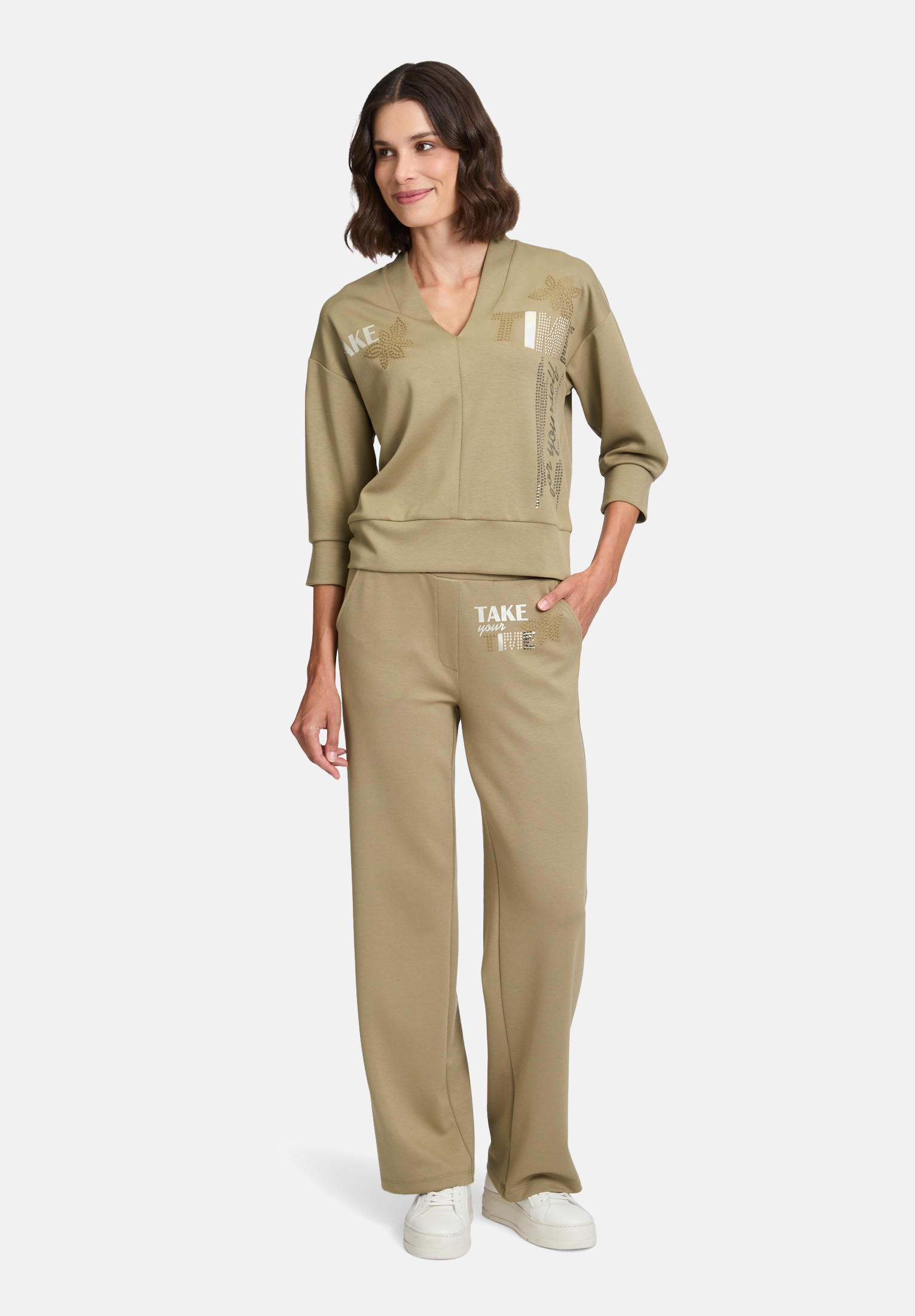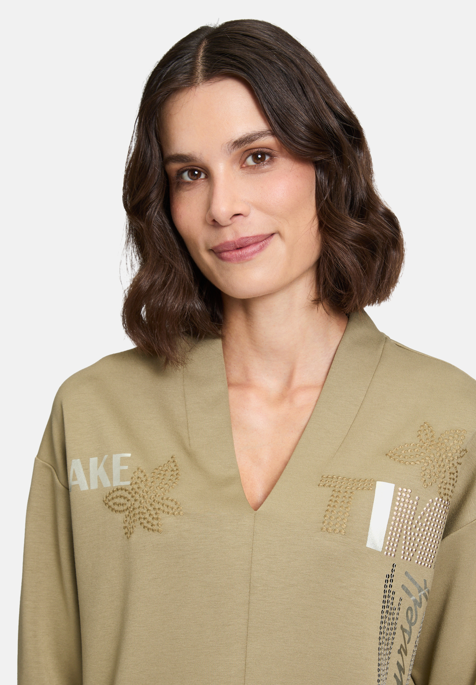 Эта повседневная толстовка с рукавами 3/4 и V-образным вырезом дополнена модным воротником-стойкой и элегантной вышивкой. Однотонный дизайн универсален, а модный крой и детали создают современный образ. Она идеально подходит для стильного повседневного ношения, сочетая комфорт и актуальный дизайн.