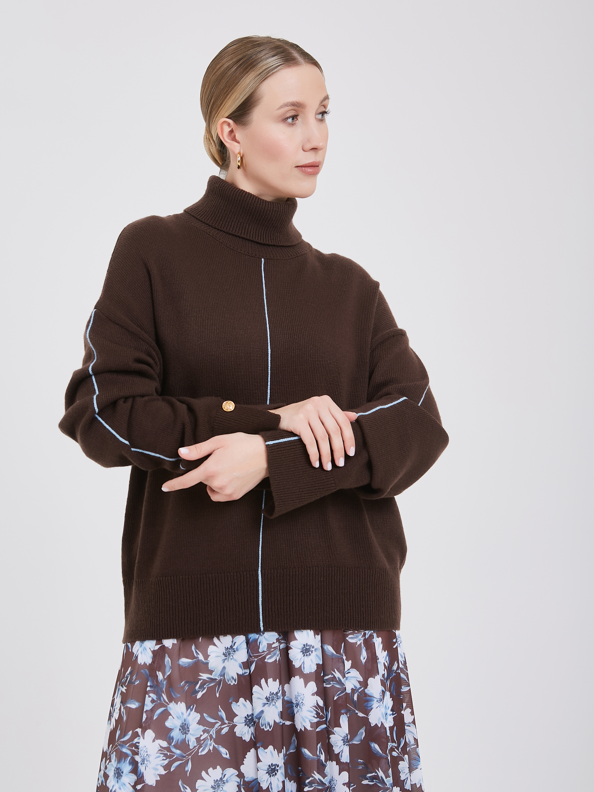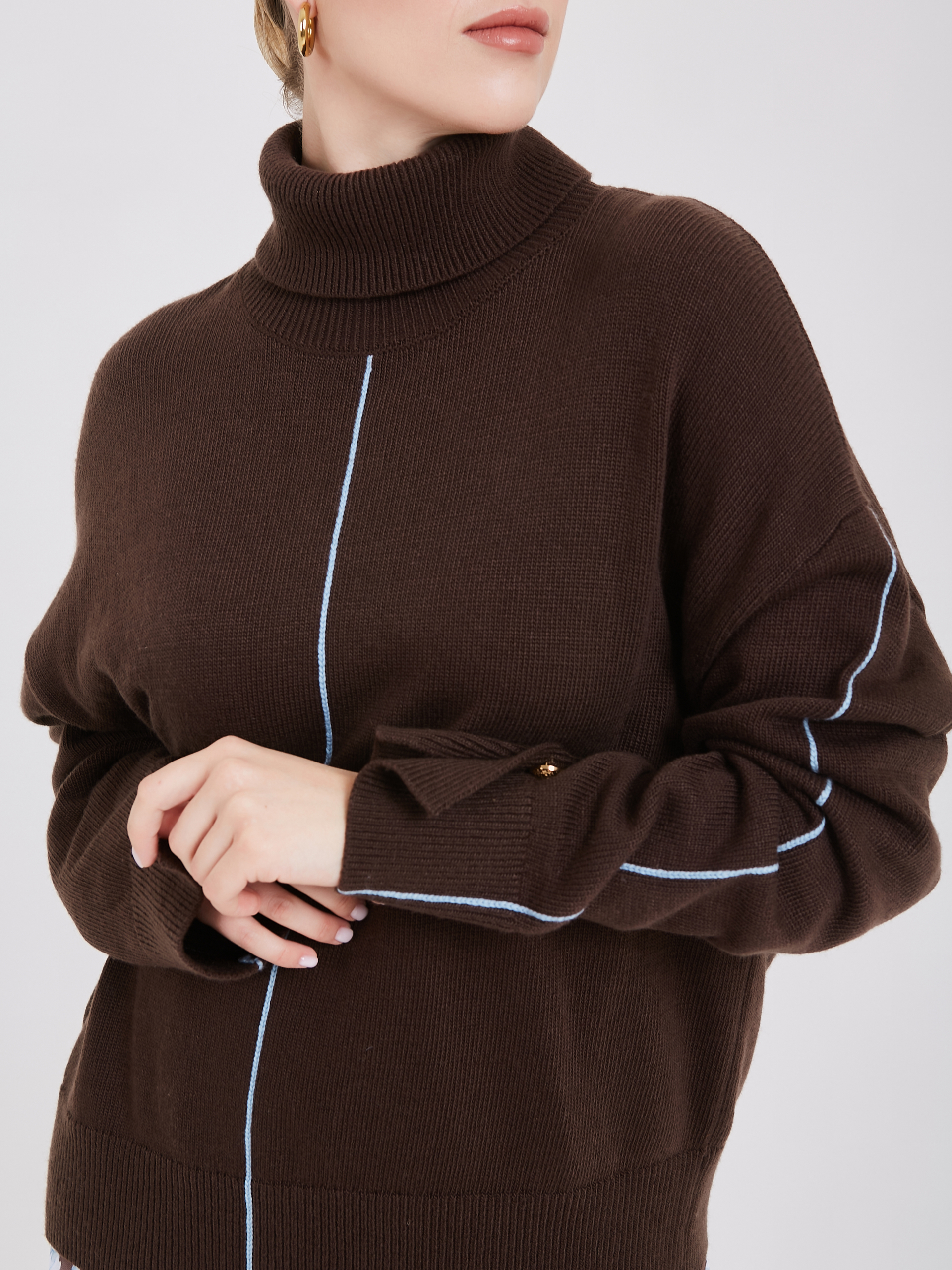 Уютный и мягкий джемпер с высоким горлом - воплощение современной умной моды. В его составе присутствует инновационная анти-пилинг нить, позволяющая сохранить высокие тактильные свойства и прочность материала. Среди деталей выделяются золотые пуговицы на манжетах, вертикальные прострочки по осям изделия контрастного голубого цвета и небольшие разрезы по манжетам и задней части горловины. Такой джемпер прекрасно подчеркивает особенности вашей фигуры, создавая неповторимый и привлекательный образ. Осень-Зима'25/26. Капсула "Вино из одуванчиков"