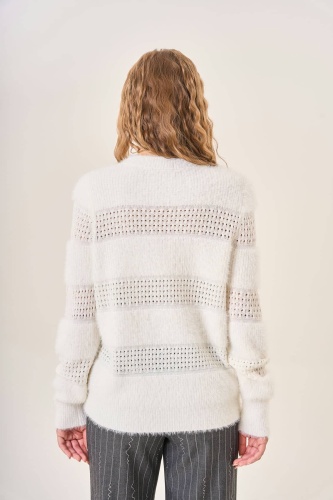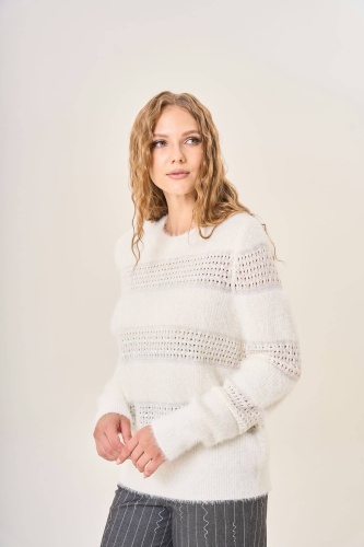 Женский молочный пушистый джемпер элегантно сочетает различные фактуры и техники вязки создавая стильный объемный рисунок. Идеально подчеркивает все преимущества фигуры корректируя недостатки благодаря мягкому облегающему крою. Рельефные полосы визуально добавляют объема и создают ощущение многослойности. Мягкий материал приятен к телу, обеспечивает тепло и уют в прохладное время года. Осень-Зима'25/26. Капсула "Вишневый сад"