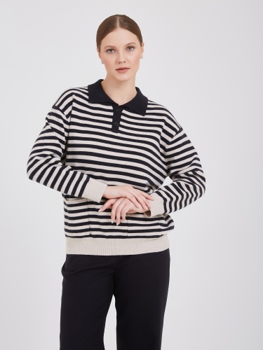 Полосатый свитер классического стиля. Темно-синие и белые горизонтальные полосы задают ритм, создавая динамичный образ. Воротник-поло и два передних кармана добавляют нотку спортивного шика. Бежевые манжеты и нижний край завершают композицию, привнося тепло и уют. Материал высокого качества обеспечивает комфорт. Осень-Зима'25/26. Капсула "Алые Паруса"