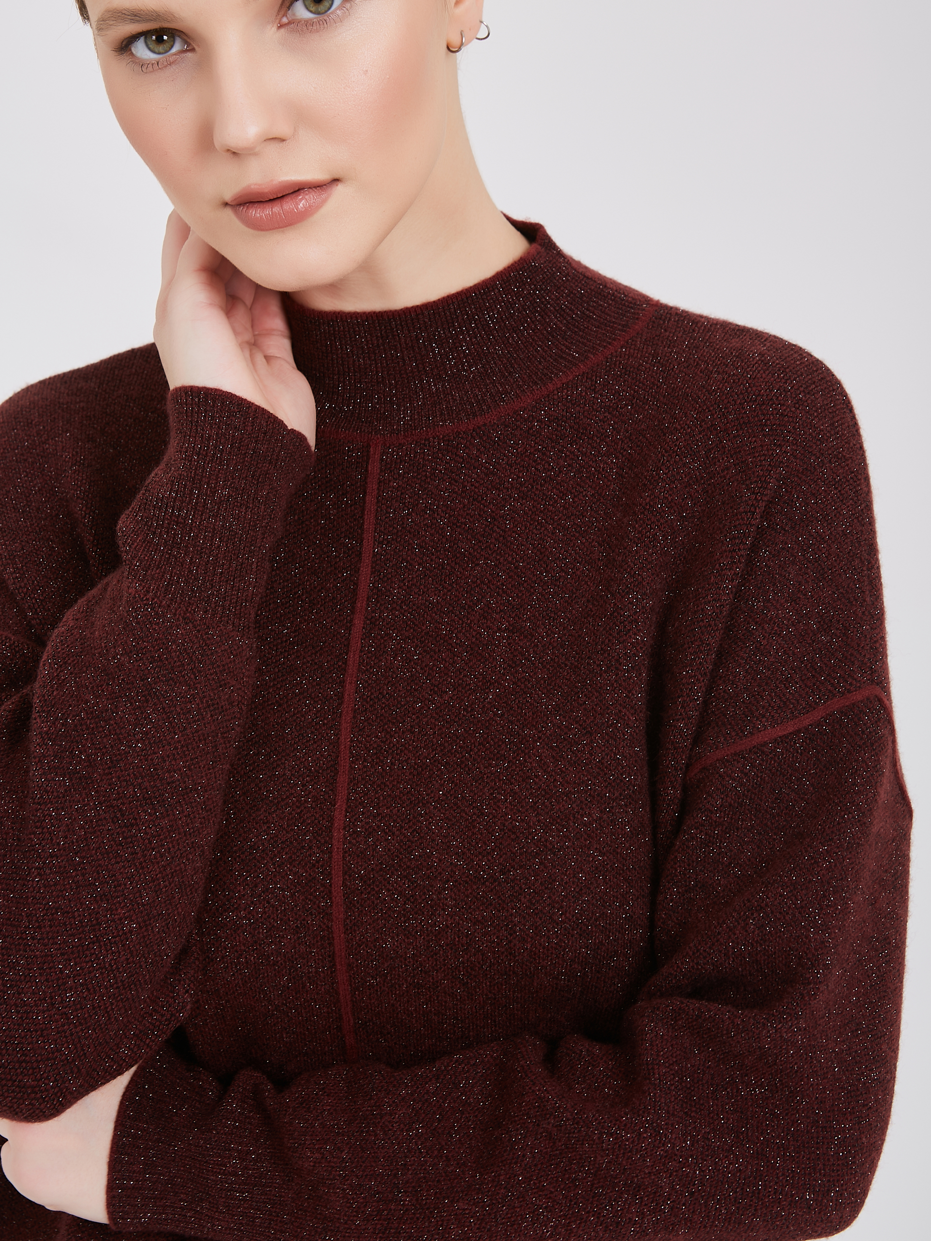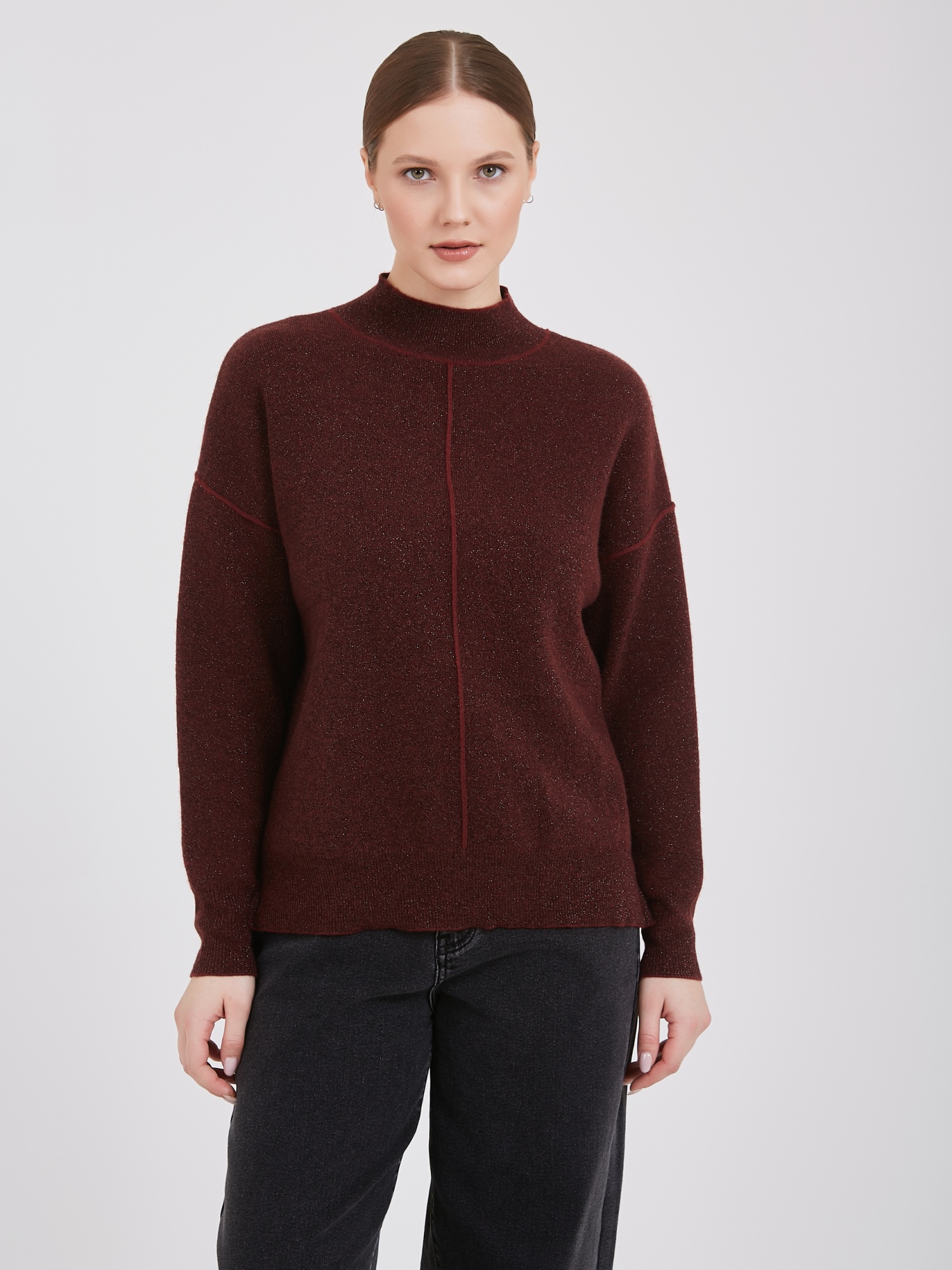 Бордовый свитер с высоким воротником и длинными рукавами. Элегантный образ подчеркивает выразительный вертикальный шов спереди. Свитер дарит ощущение комфорта и тепла в холодную погоду.Осень-Зима'25/26. Капсула "Вишневый сад"