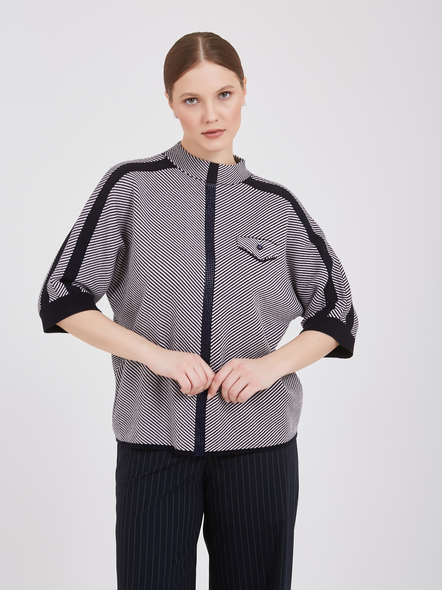 Женский джемпер с динамичным дизайном: диагональные полосы белого и тёмно-синего оттенков начинаются от правого плеча и плавно спускаются к левому краю. Центральная линия и плечи украшены контрастной тёмно-синей отделкой, усиливающей визуальное восприятие. Небольшой накладной карман слева добавляет функциональности и поддерживает общую стилистику полосатой композиции.Осень-Зима'25/26. Капсула "Лиловый шар"