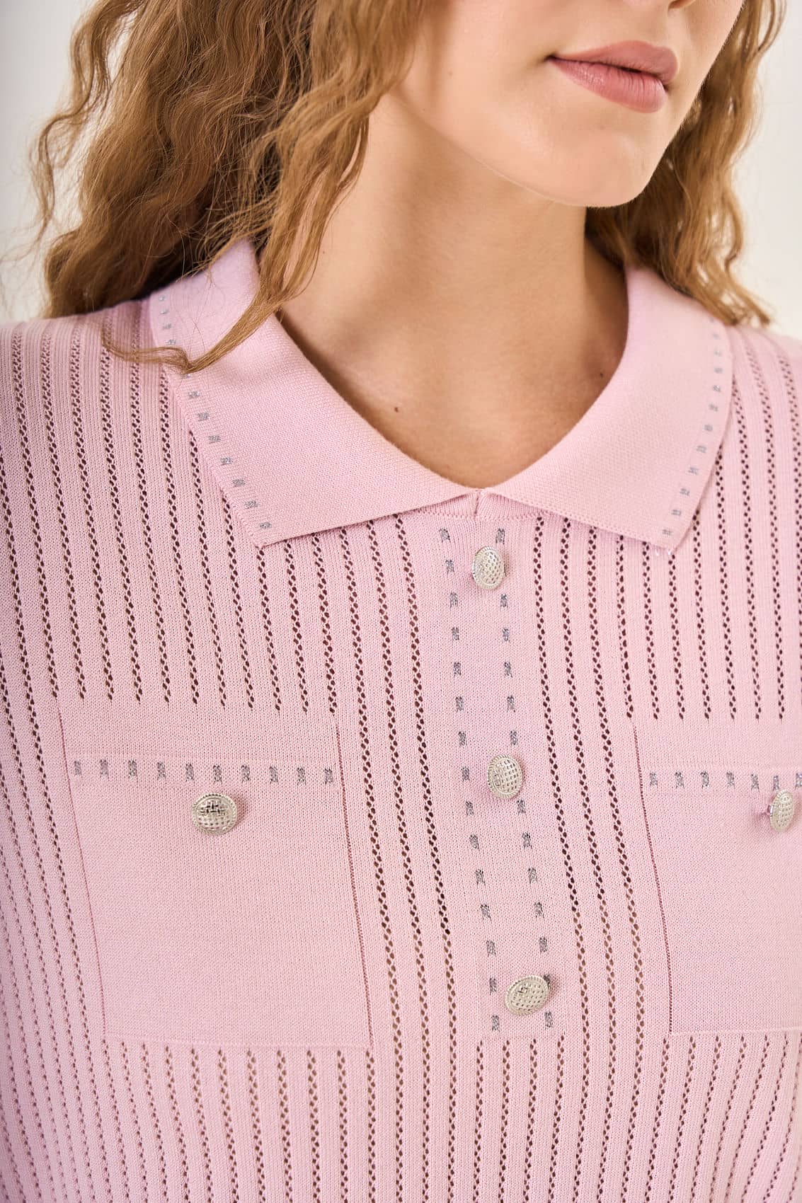 Розовая вязаная рубашка-поло с короткими рукавами. Классический воротник и три декоративные пуговицы придают ей нотку элегантности. Два небольших накладных кармана на груди украшены декоративными деталями, похожими на пуговицы или броши, добавляя шарм и оригинальность. Вертикальный ажурный узор делает рубашку воздушной и привлекательной.Отлично подойдет для создания нежного и современного образа.