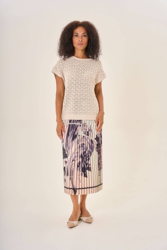 Бежевая вязаная кофта с короткими рукавами. Рельефный узор в виде ромбов добавляет изделию выразительности и уникальности. Мягкий натуральный материал обеспечивает комфорт. Универсальная модель прекрасно дополнит любой наряд, придавая ему уютный и гармоничный вид.
