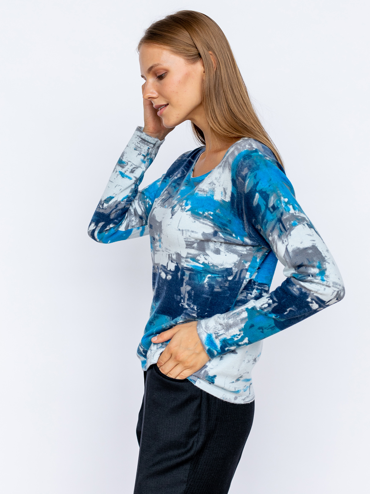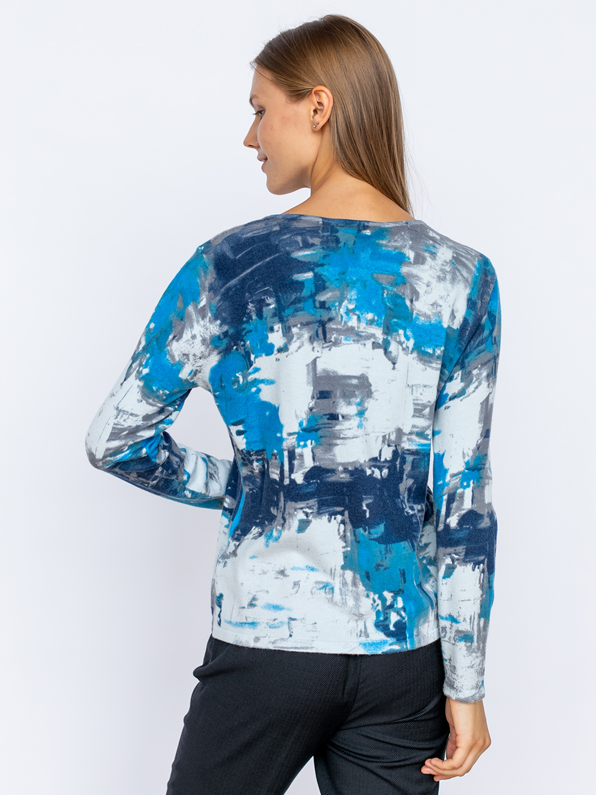 Джемпер с ярким абстрактным принтом выполнен в трех оттенках: бордовом, синем и коричневом. Широкий овальный вырез горловины подчеркивает изящество линии шеи. Полуприлегающий силуэт подчеркивает женственность форм. Джемпер сочетаетается с юбкой и брюками и расставляет яркие акценты в вашем аутфите.