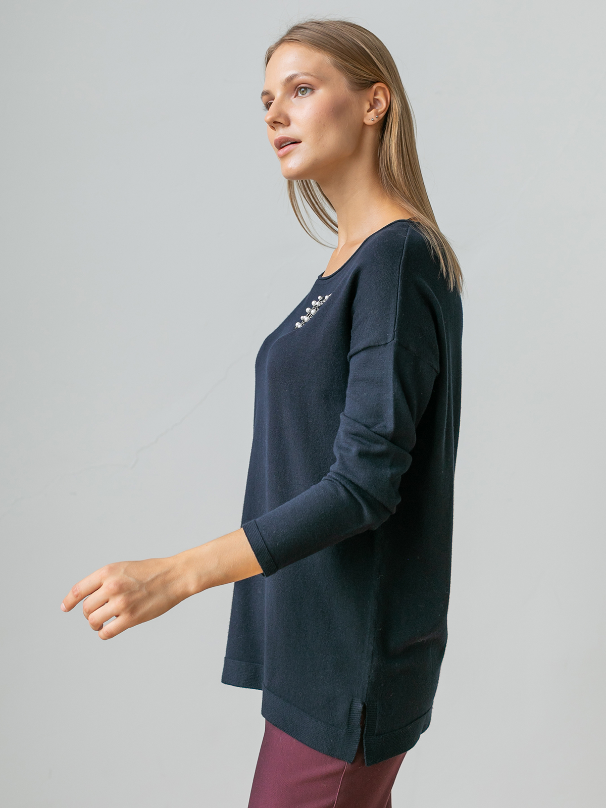 На сайте указаны российские размеры. Ткань: выполнен из гладкой вискозы (75%) и полиамида (25%). Крой: удлинённый джемпер свободного силуэта с круглым вырезом. Струящаяся вискоза, слегка опущенная зона плеча и благородный глубокий цвет создают женственный и романтичный образ. Удлиненная модель прикрывает зона живот и бедер, что позволяет скрыть возможные нюансы фигуры и чувствовать только мягкое тепло и комфорт. Разрезы по бокам обеспечивают дополнительный комфорт при движении. Отделка: лаконичность модели можно усложнять украшениями – подвесками и брошами. Найдите идеальный низ в огромном ассортименте Stern, представленном на сайте.