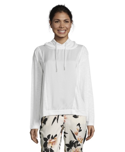 Джемпер прямого покроя. Длинные рукава, капюшон на кулиске. Сочетание приятных к телу материалов. Отличный вариант для прогулок и занятий спортом.