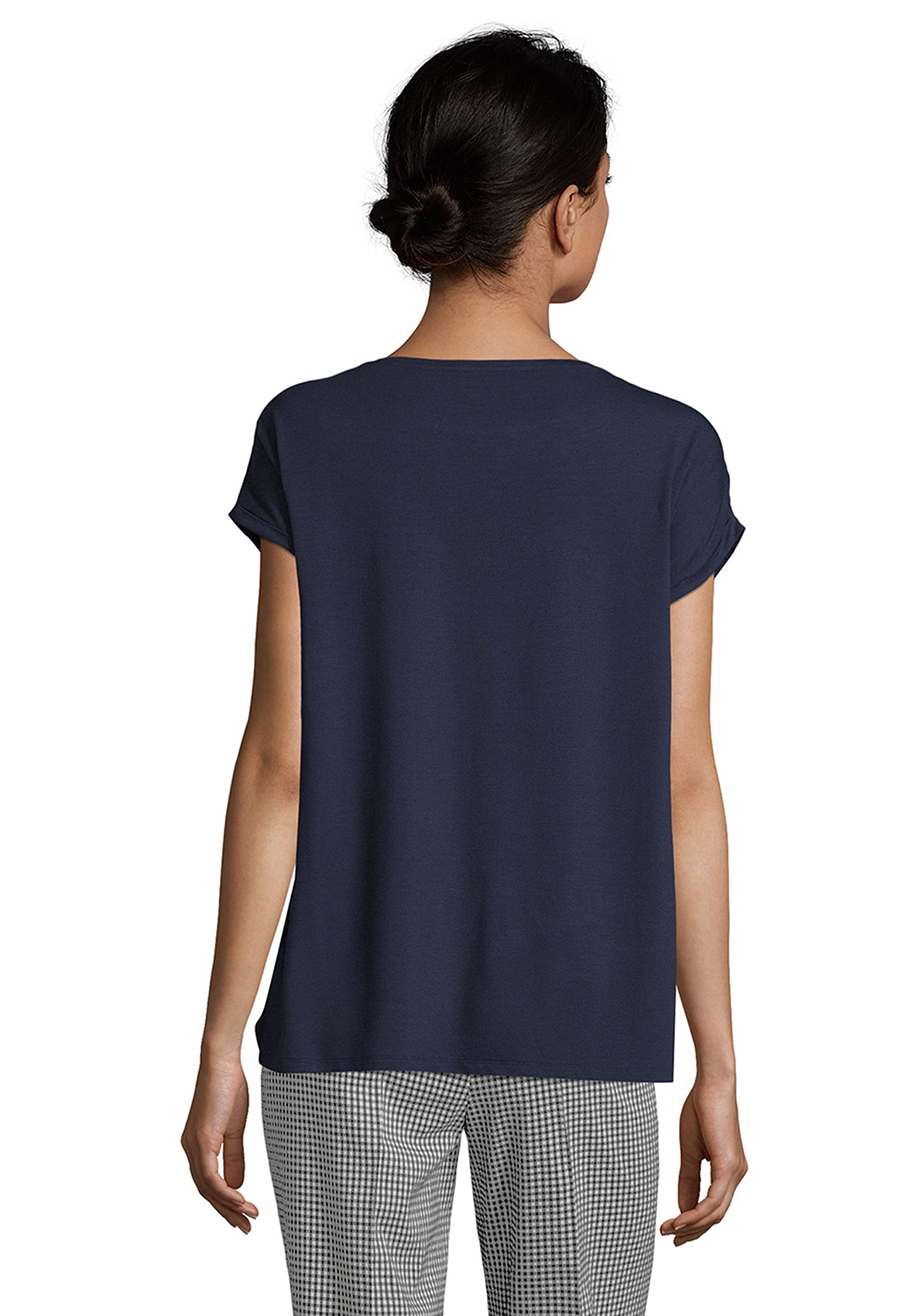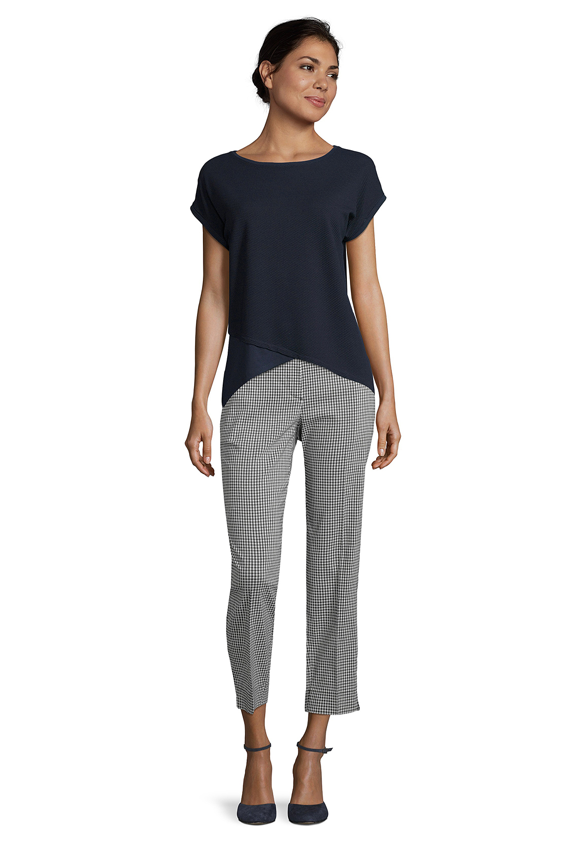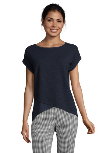 Футболка полуприталенного силуэта. Необычная фактурная ткань переда изделия. Вырез горловины "лодочка" подчеркивает элегантность и женственность обладательницы футболки. Короткие цельнокроеные рукава оформлены фиксированными манжетами. Еще один элемент дизайна - имитация многослойного низа футболки. Приятный к телу материал из вискозной смеси.