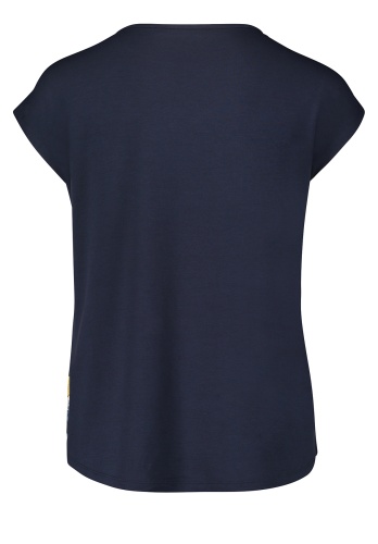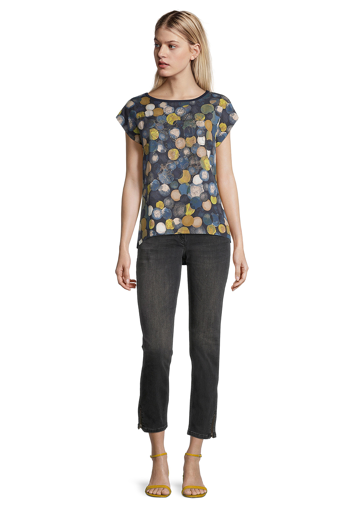Футболка свободного покроя. Вырез горловины "лодочка", короткие цельнокроеные рукава. Приятный к телу материал из вискозной смеси. Принт в горошек по переду изделия, декор стразами придает легкий блеск. Спинка изделия выполнена из однотонного материала.