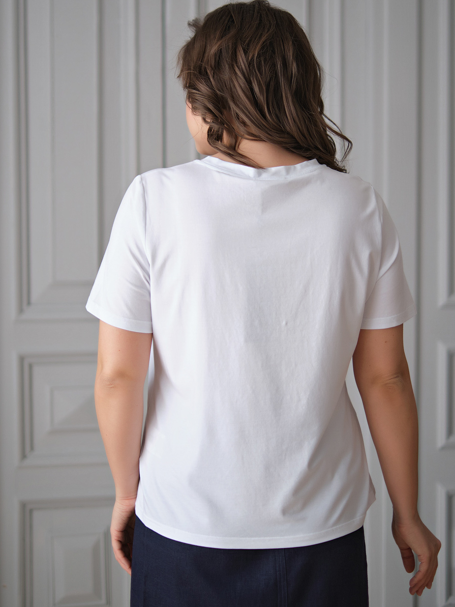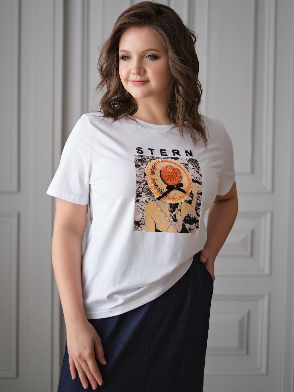На сайте указаны российские размеры. Ткань: смесь из гладкого комфортного модала ( 47,5%), дышавшего хлопка (47,5%) и эластана (5%). Крой: белая базовая футболка слегка приталенного силуэта. Имеет круглый неглубокий вырез и короткий свободный рукав-реглан. Футболка средней длины, закрывает область живота, не поднимается вверх при движении. Отделка: Stern-girl достаточно всего самого лучшего: стильного принта с девушкой в шляпке, украшенного россыпью переливающихся бусин, жемчужного бисера и сверкающих пайеток. Вышитая камнями надпись Stern позволяет видеть обладательницу хорошего вкуса издалека! Сочетается с брюками, джинсами, юбками и шортами из ассортимента Stern.