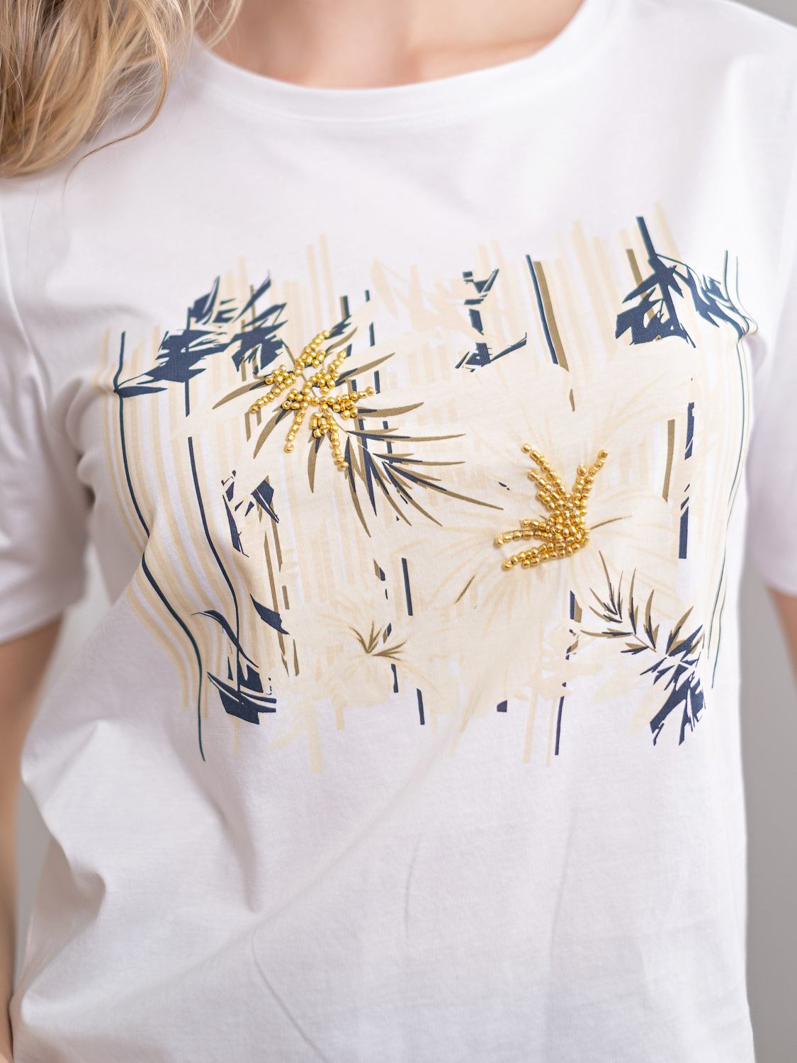 На сайте указаны российские размеры. Ткань: выполнена из 100% гладкого хлопка высокого качества. Крой: слегка приталенная модель, подчеркивающая достоинства фигуры. Имеет круглый вырез и втачной рукав-реглан. Футболка выполнена из гладкого, приятного телу хлопка, который дарит максимальный комфорт – не натирает и не раздражает кожу. Отделка: природный принт украшен золотистым калиброванным бисером, который служит дорогим акцентом всему образу. Сочетается с брюками, джинсами, юбками и шортами из ассортимента Stern.